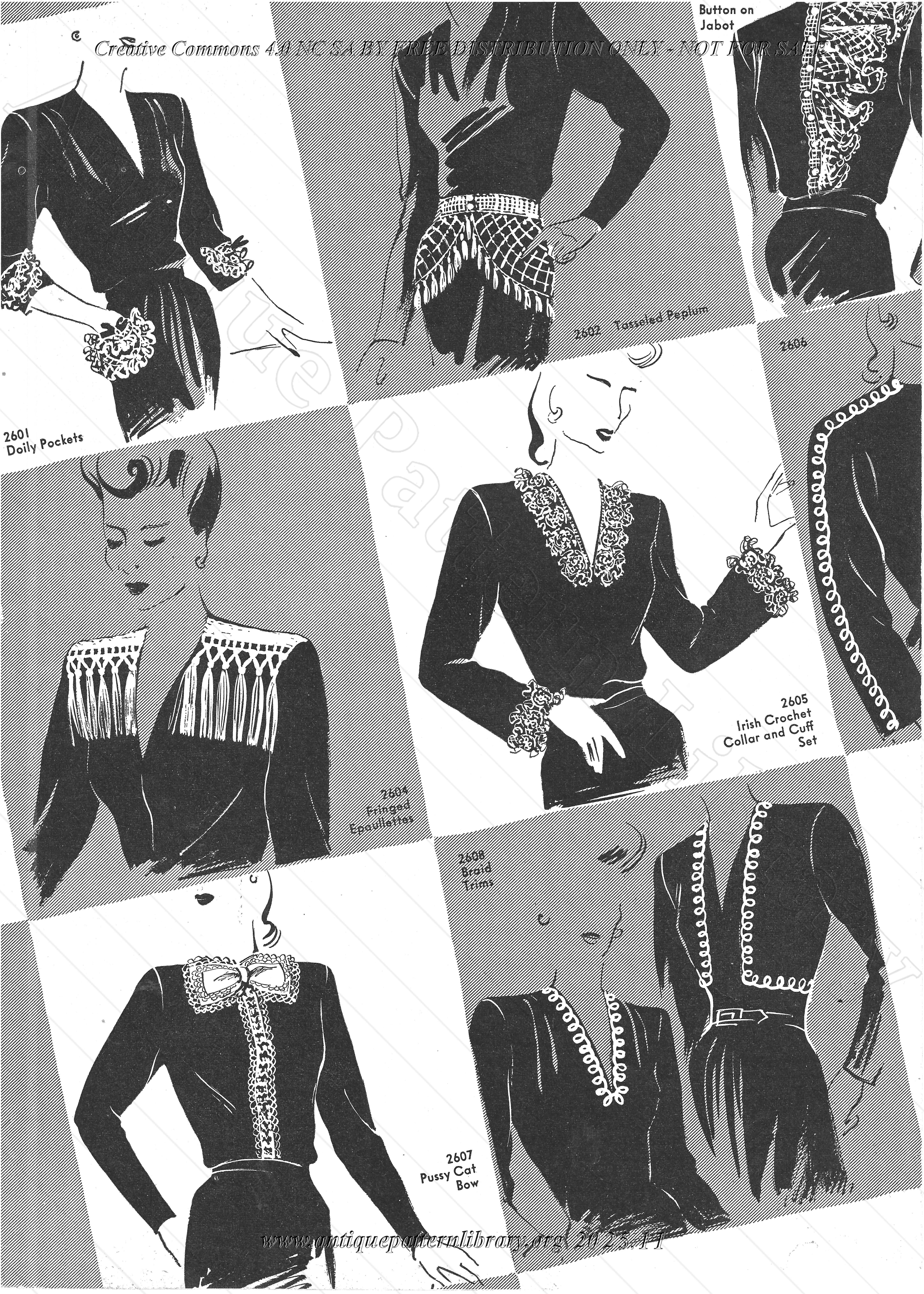 Crocheted trims for dresses, jackets, hats, and lingerie. Collars, jabots, blouse fronts (dickeys), braided frogs, many edgings. Tips on how to sew childrens dresses from old clothing and adapt clothes as the child grows. Includes patterns 2601 Doily Pockets, 2602 Tasseled Peplum, 2603 Button on Jabot, 2604 Fringed Epaulettes, 2605 Irish Crochet Collar and Cuffs, 2609 Cut-me-down Dickey, 2610 Butterfly Crocheted Dickey, 2611 Braided Frogs, 2612 Violets, 2613 Colonial Jabot, 2614 Basic Pillbox, 2615 Braid and Button, 2616 Fringed Tassel, 2617 Ruffled Edge, 2618 Crocheted Ball Fringe, 2619 Curly Braid, 2620 Doilies, 2621 Leaf and Braid, 2623 Basic Sailor, 2622 Lace Ruffle, 2624 Nightgown Frill, 2625 Slip Trim and Straps, 2626 Crocheted Camisole, 2627 Irish Crochet Edging, 2628 Pantie Lace, 2629 The Popular Fascinator, 2630 Bags, Gloves and Calot from Scraps, 2631 Jewelry , 2632 Belt with Pockets, 2633 Sunsuit from an old Apron, 2634 Dress, 2635 Pinafore, 2636 Slip Edging, 2606 and 2608 Braid Trim, 2607 Pussy Cat Bow.