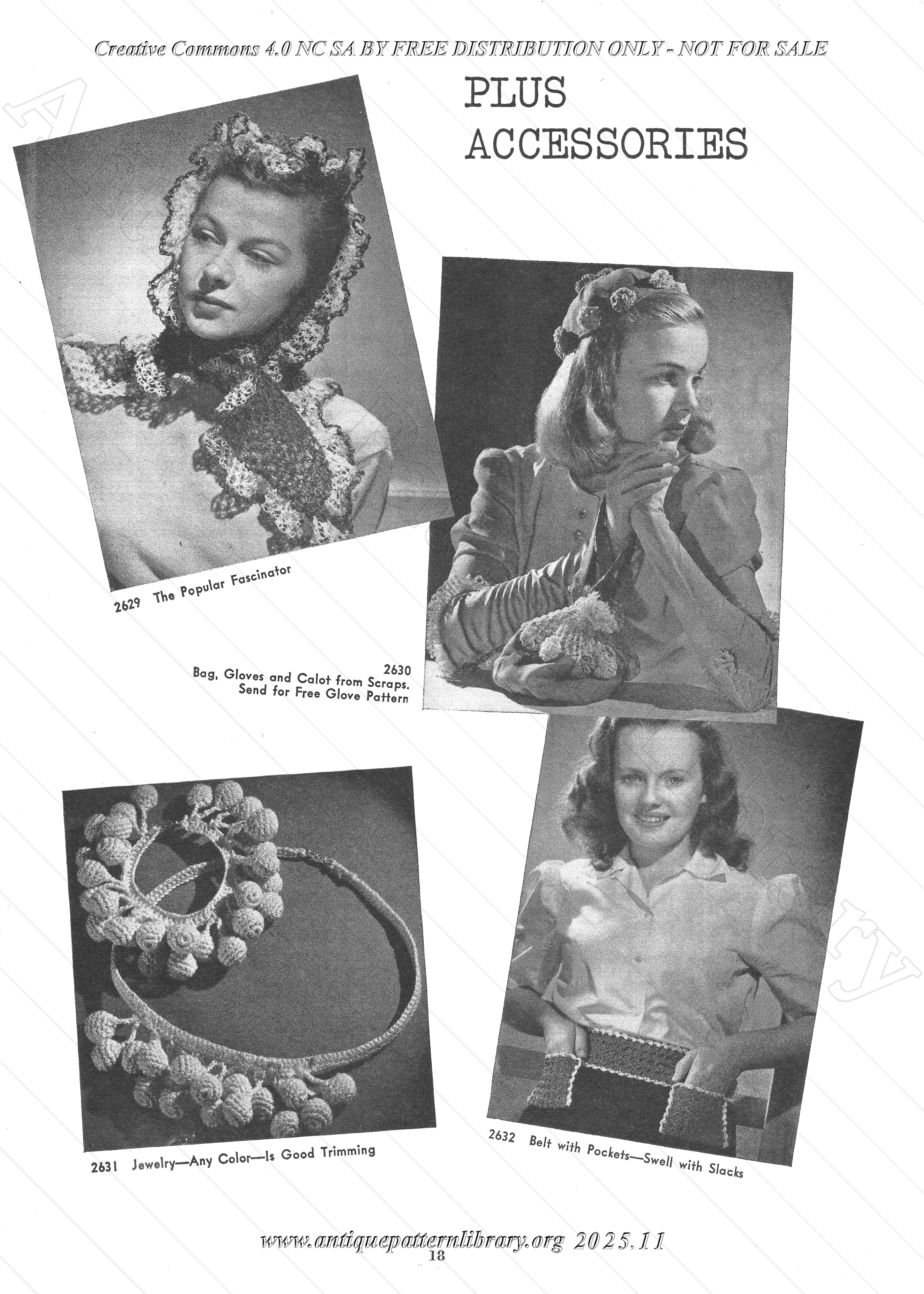 Crocheted trims for dresses, jackets, hats, and lingerie. Collars, jabots, blouse fronts (dickeys), braided frogs, many edgings. Tips on how to sew childrens dresses from old clothing and adapt clothes as the child grows. Includes patterns 2601 Doily Pockets, 2602 Tasseled Peplum, 2603 Button on Jabot, 2604 Fringed Epaulettes, 2605 Irish Crochet Collar and Cuffs, 2609 Cut-me-down Dickey, 2610 Butterfly Crocheted Dickey, 2611 Braided Frogs, 2612 Violets, 2613 Colonial Jabot, 2614 Basic Pillbox, 2615 Braid and Button, 2616 Fringed Tassel, 2617 Ruffled Edge, 2618 Crocheted Ball Fringe, 2619 Curly Braid, 2620 Doilies, 2621 Leaf and Braid, 2623 Basic Sailor, 2622 Lace Ruffle, 2624 Nightgown Frill, 2625 Slip Trim and Straps, 2626 Crocheted Camisole, 2627 Irish Crochet Edging, 2628 Pantie Lace, 2629 The Popular Fascinator, 2630 Bags, Gloves and Calot from Scraps, 2631 Jewelry , 2632 Belt with Pockets, 2633 Sunsuit from an old Apron, 2634 Dress, 2635 Pinafore, 2636 Slip Edging, 2606 and 2608 Braid Trim, 2607 Pussy Cat Bow.
