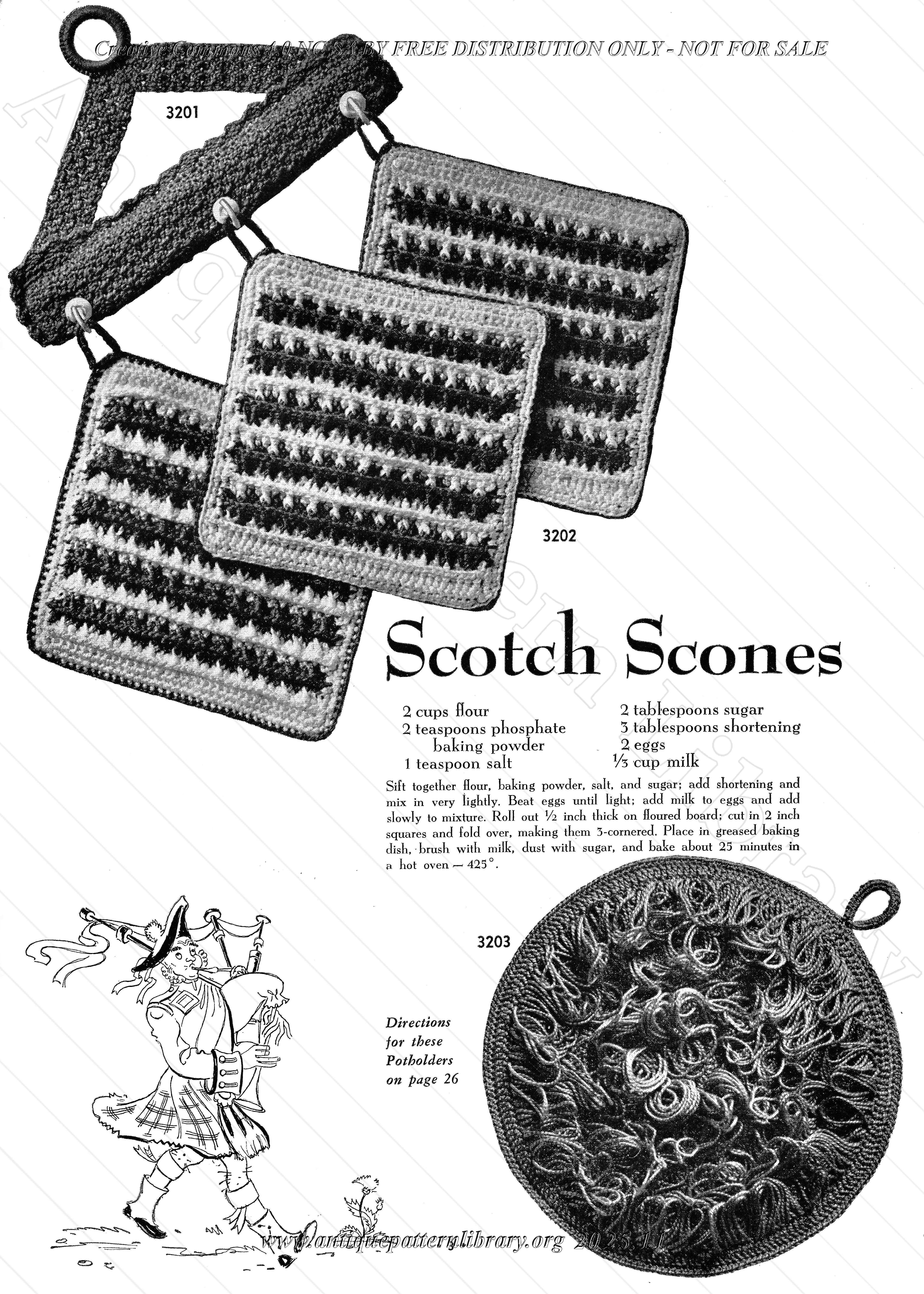 Half of the pages show pot holder illustrations and recipes , the other half has the patterns for the crocheted potholders. Square potholders, round, in the shape of dogs, cats, pot and kettle, floral, mitten and shoe, fan, root and maize. Some pot holders are appliqued or embroiderd afterwards. The recipes are for Scotch Scones, Oyster Bisque, Dogs à La, Barbecued Spare Ribs, Parsley Puffs, Eggs Foo Young, Watercress Stuffing, Russian Pilaf, Curry of Shrimp, Green Tomato Pickles, Iced Fruit Soup, Chicken Gumbo.
