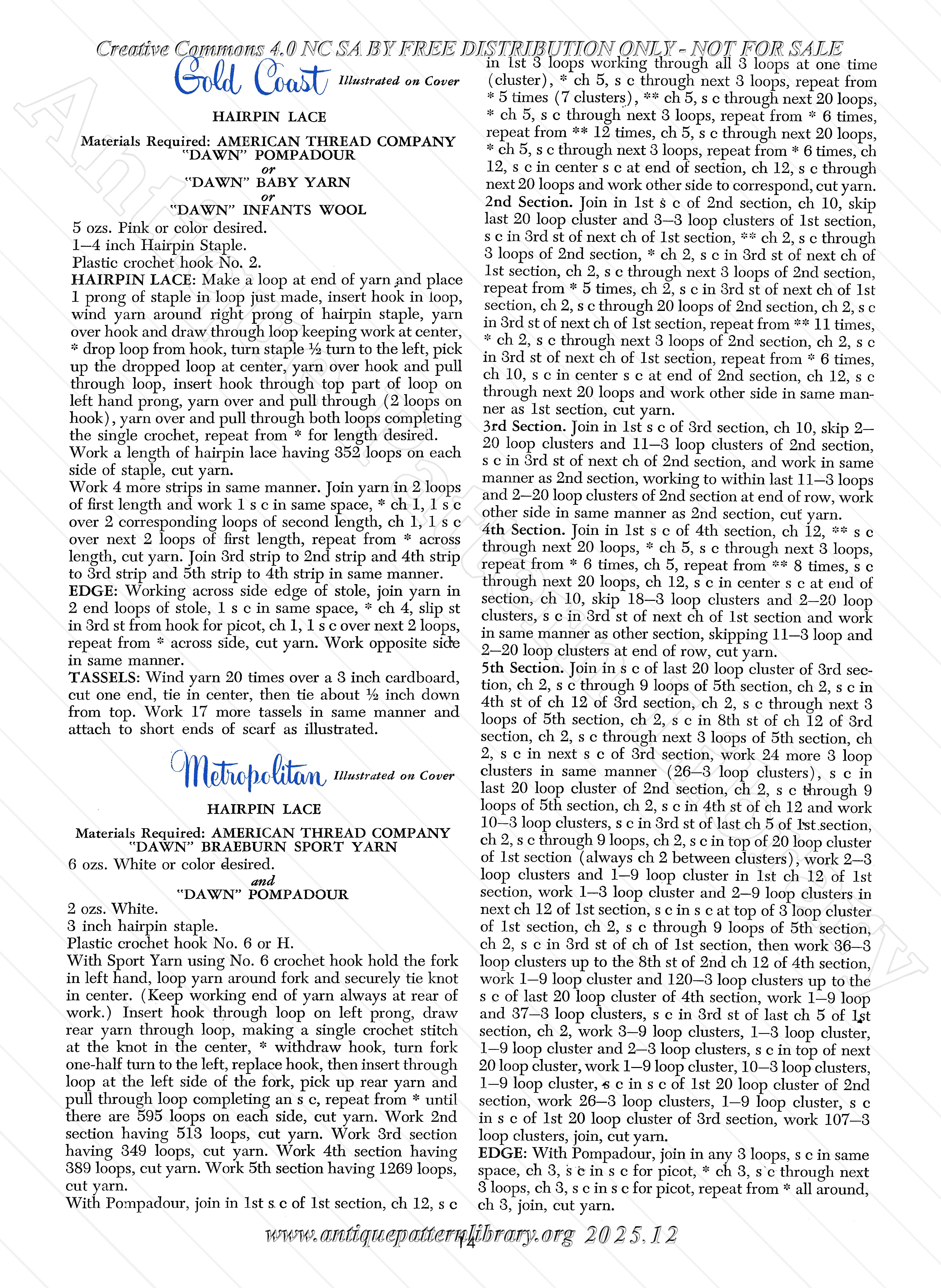 Knitting: Park Avenue, Nob Hill, Beacon Hill, Country Club, Plaza. Crochet: Peachtree Street, La Louisian, Wilshire, Campus Queen. Hairpin Lace: Esplanade, Gold Coast, Metropolian. All patterns are illustrated. Dated 1951.