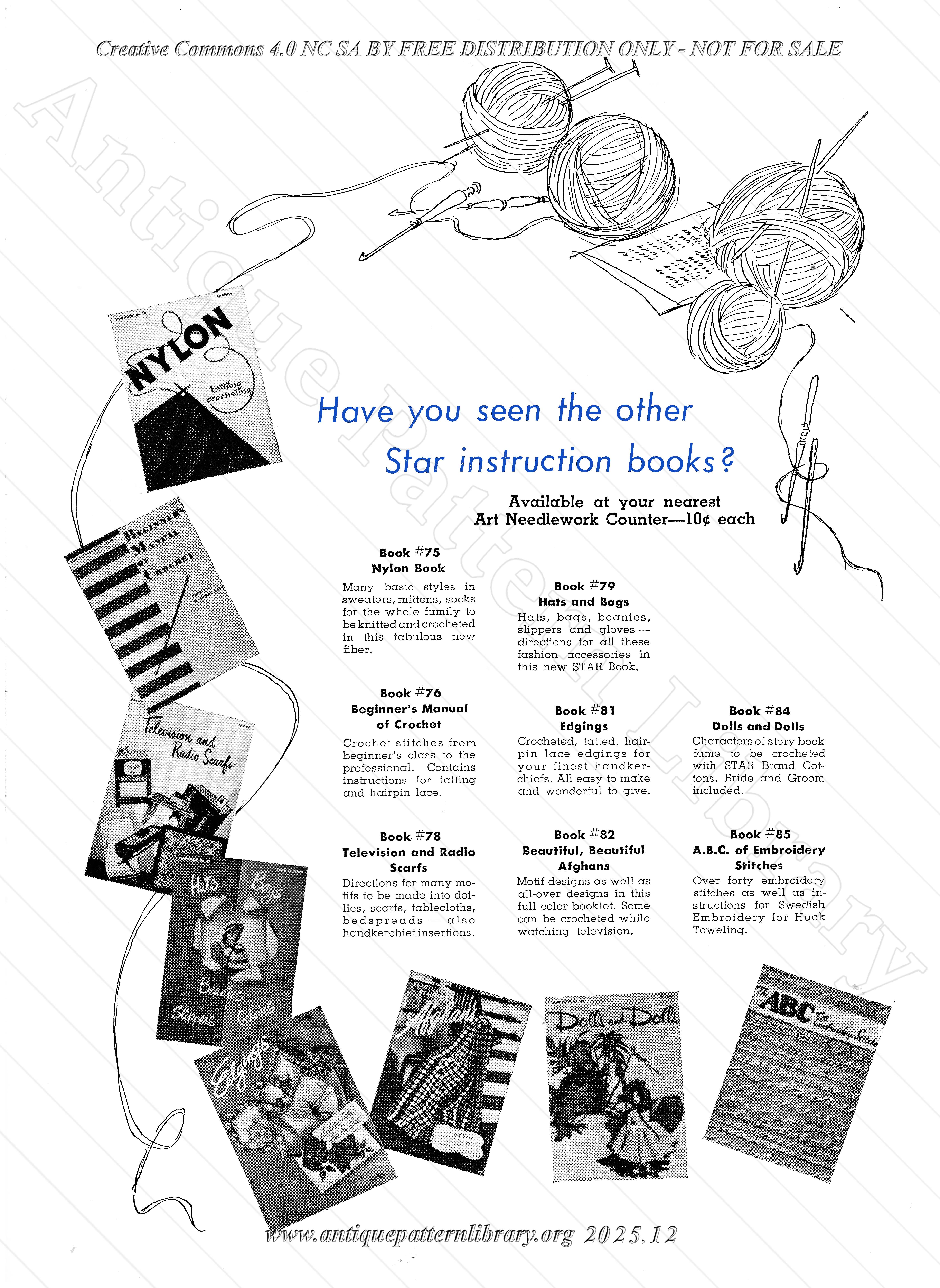 Knitting: Park Avenue, Nob Hill, Beacon Hill, Country Club, Plaza. Crochet: Peachtree Street, La Louisian, Wilshire, Campus Queen. Hairpin Lace: Esplanade, Gold Coast, Metropolian. All patterns are illustrated. Dated 1951.