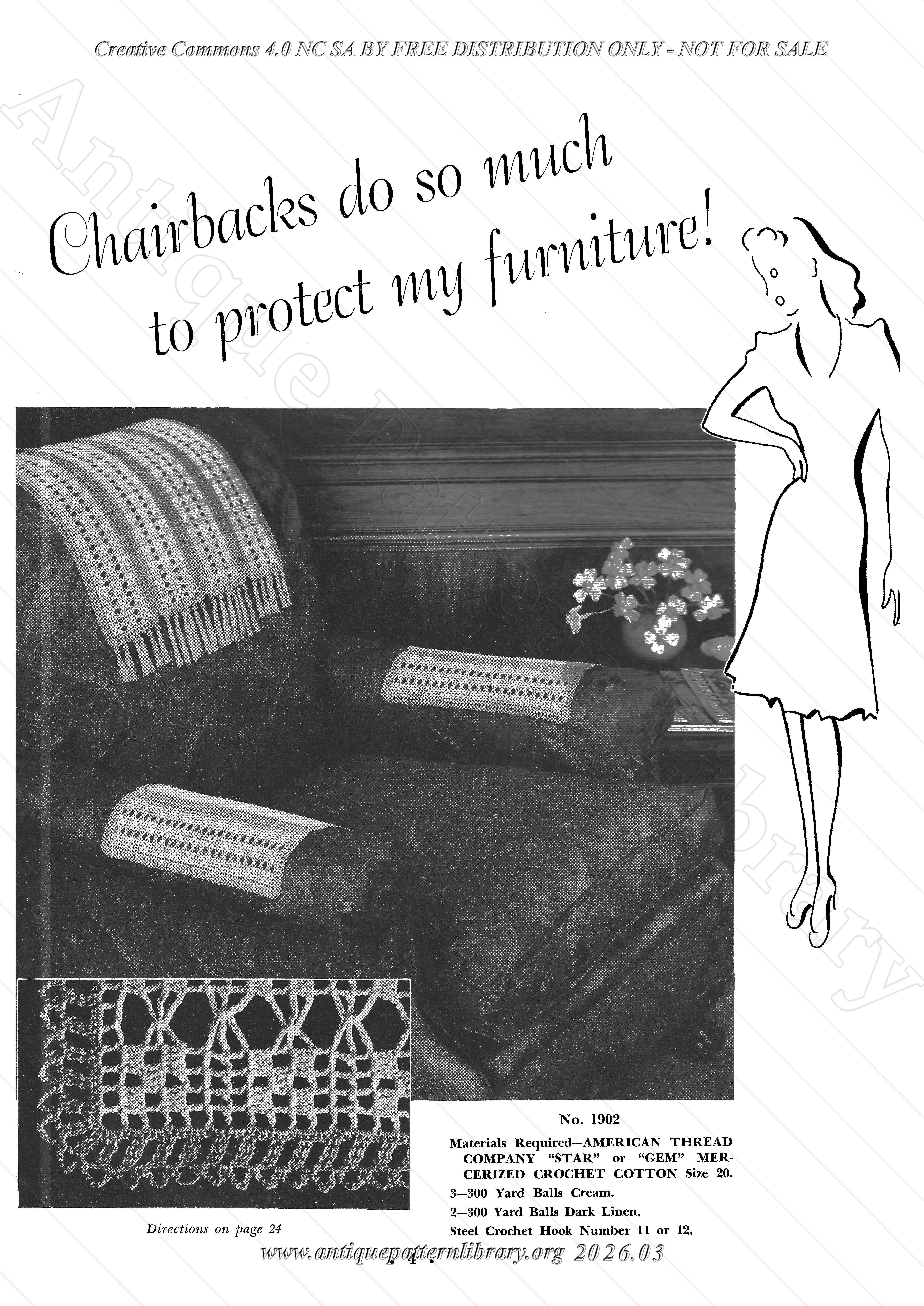Needlepoint crochet for a footstool no. 1901, crocheted (no. 1902 and 1903) and knitted (no. 1904) chairbacks, complete with armrest covers, daisy motif no. 1905, crocheted doily no. 1906, tatted doily no. 1907, crocheted doily in 2 colors no. 1908, crocheted motif for table scarf of cluny design no. 1909, tatted motif for same no. 1910, porch set (placemats) no. 1911, lacy table cloth no. 1912, daisy lunch cloth no. 1913, filet and popcorn bedspread no. 1914, bridge set no. 1915, luncheon set (placemats, napkins and centerpiece) no. 1916, crocheted cross-stitch rug no. 1917, crocheted rug with tufted edge no. 1918, huck towel edge no. 1919-A, crochet-trimmed Turkish Towel no. 1920-A, crocheted flower basket no. 1921, hot plate mats no. 1922 and 1923,