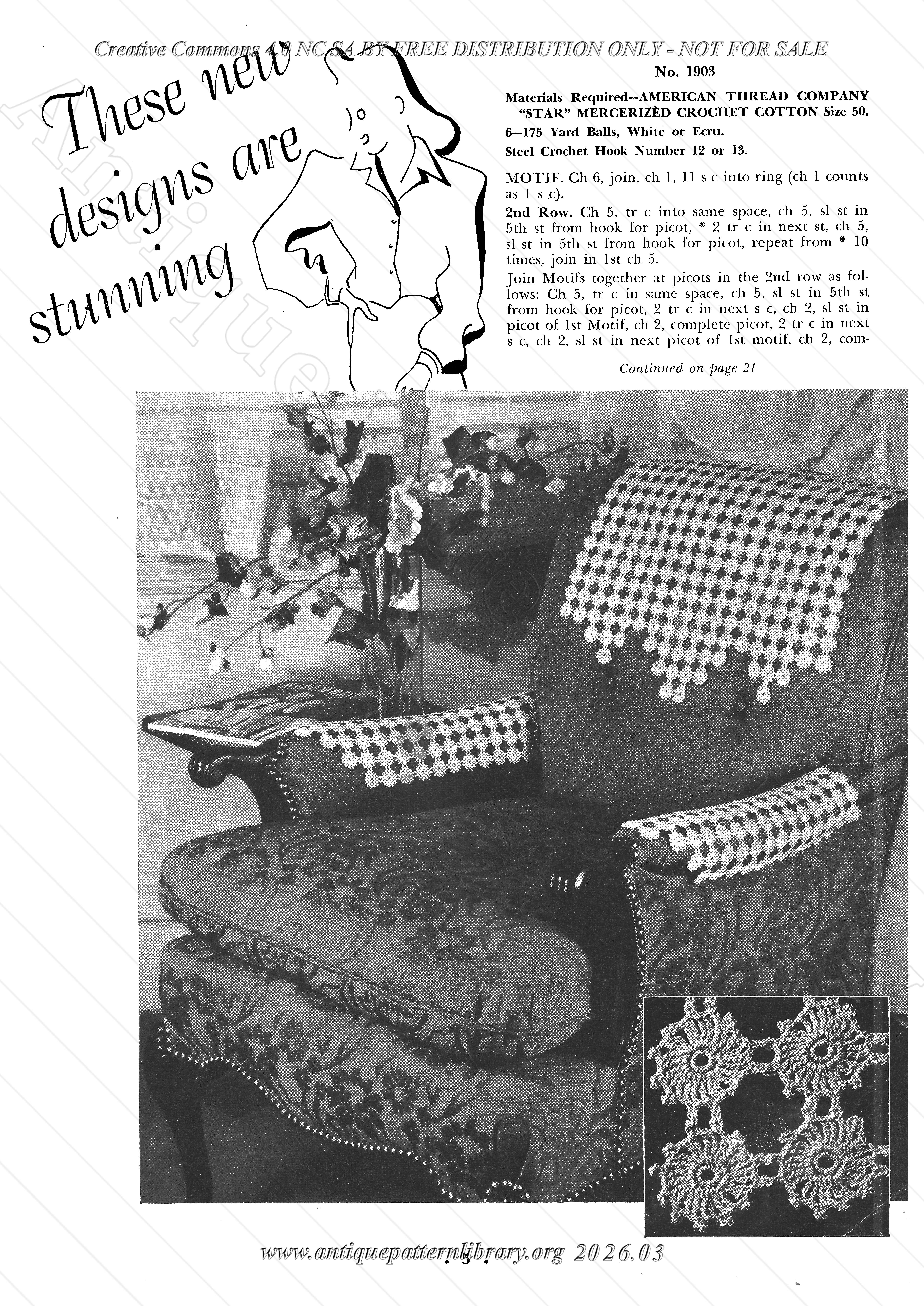 Needlepoint crochet for a footstool no. 1901, crocheted (no. 1902 and 1903) and knitted (no. 1904) chairbacks, complete with armrest covers, daisy motif no. 1905, crocheted doily no. 1906, tatted doily no. 1907, crocheted doily in 2 colors no. 1908, crocheted motif for table scarf of cluny design no. 1909, tatted motif for same no. 1910, porch set (placemats) no. 1911, lacy table cloth no. 1912, daisy lunch cloth no. 1913, filet and popcorn bedspread no. 1914, bridge set no. 1915, luncheon set (placemats, napkins and centerpiece) no. 1916, crocheted cross-stitch rug no. 1917, crocheted rug with tufted edge no. 1918, huck towel edge no. 1919-A, crochet-trimmed Turkish Towel no. 1920-A, crocheted flower basket no. 1921, hot plate mats no. 1922 and 1923,