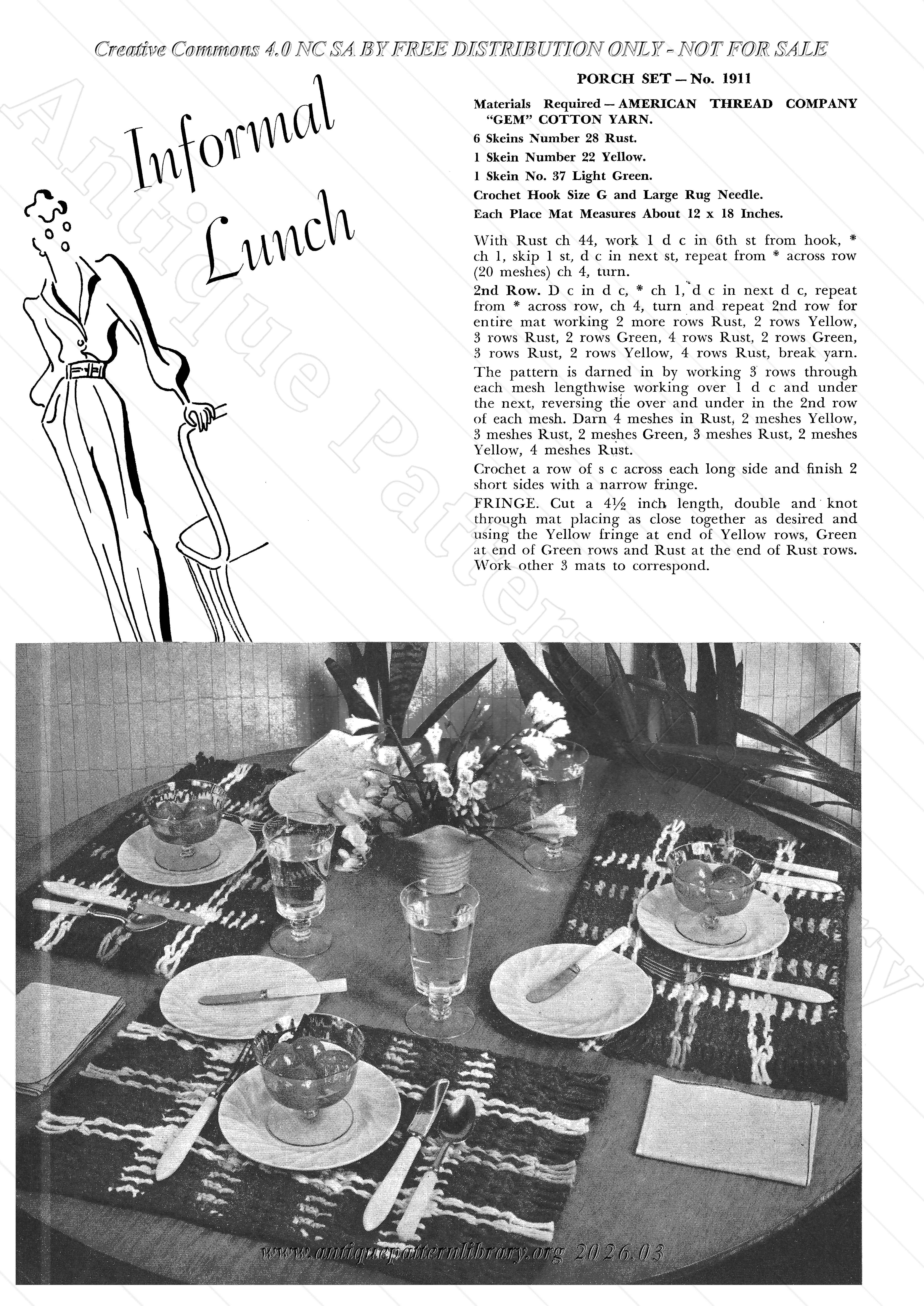 Needlepoint crochet for a footstool no. 1901, crocheted (no. 1902 and 1903) and knitted (no. 1904) chairbacks, complete with armrest covers, daisy motif no. 1905, crocheted doily no. 1906, tatted doily no. 1907, crocheted doily in 2 colors no. 1908, crocheted motif for table scarf of cluny design no. 1909, tatted motif for same no. 1910, porch set (placemats) no. 1911, lacy table cloth no. 1912, daisy lunch cloth no. 1913, filet and popcorn bedspread no. 1914, bridge set no. 1915, luncheon set (placemats, napkins and centerpiece) no. 1916, crocheted cross-stitch rug no. 1917, crocheted rug with tufted edge no. 1918, huck towel edge no. 1919-A, crochet-trimmed Turkish Towel no. 1920-A, crocheted flower basket no. 1921, hot plate mats no. 1922 and 1923,