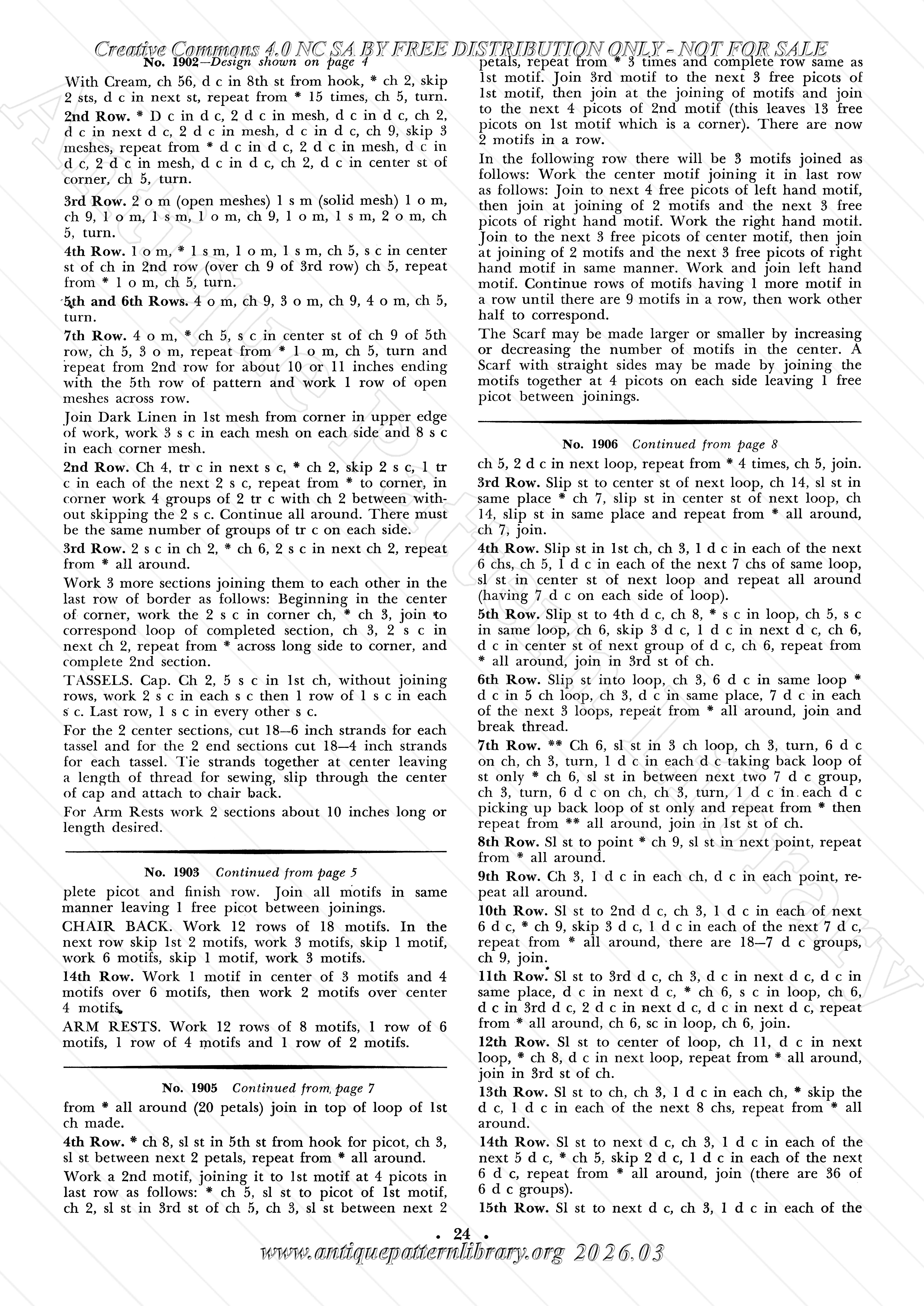 Needlepoint crochet for a footstool no. 1901, crocheted (no. 1902 and 1903) and knitted (no. 1904) chairbacks, complete with armrest covers, daisy motif no. 1905, crocheted doily no. 1906, tatted doily no. 1907, crocheted doily in 2 colors no. 1908, crocheted motif for table scarf of cluny design no. 1909, tatted motif for same no. 1910, porch set (placemats) no. 1911, lacy table cloth no. 1912, daisy lunch cloth no. 1913, filet and popcorn bedspread no. 1914, bridge set no. 1915, luncheon set (placemats, napkins and centerpiece) no. 1916, crocheted cross-stitch rug no. 1917, crocheted rug with tufted edge no. 1918, huck towel edge no. 1919-A, crochet-trimmed Turkish Towel no. 1920-A, crocheted flower basket no. 1921, hot plate mats no. 1922 and 1923,