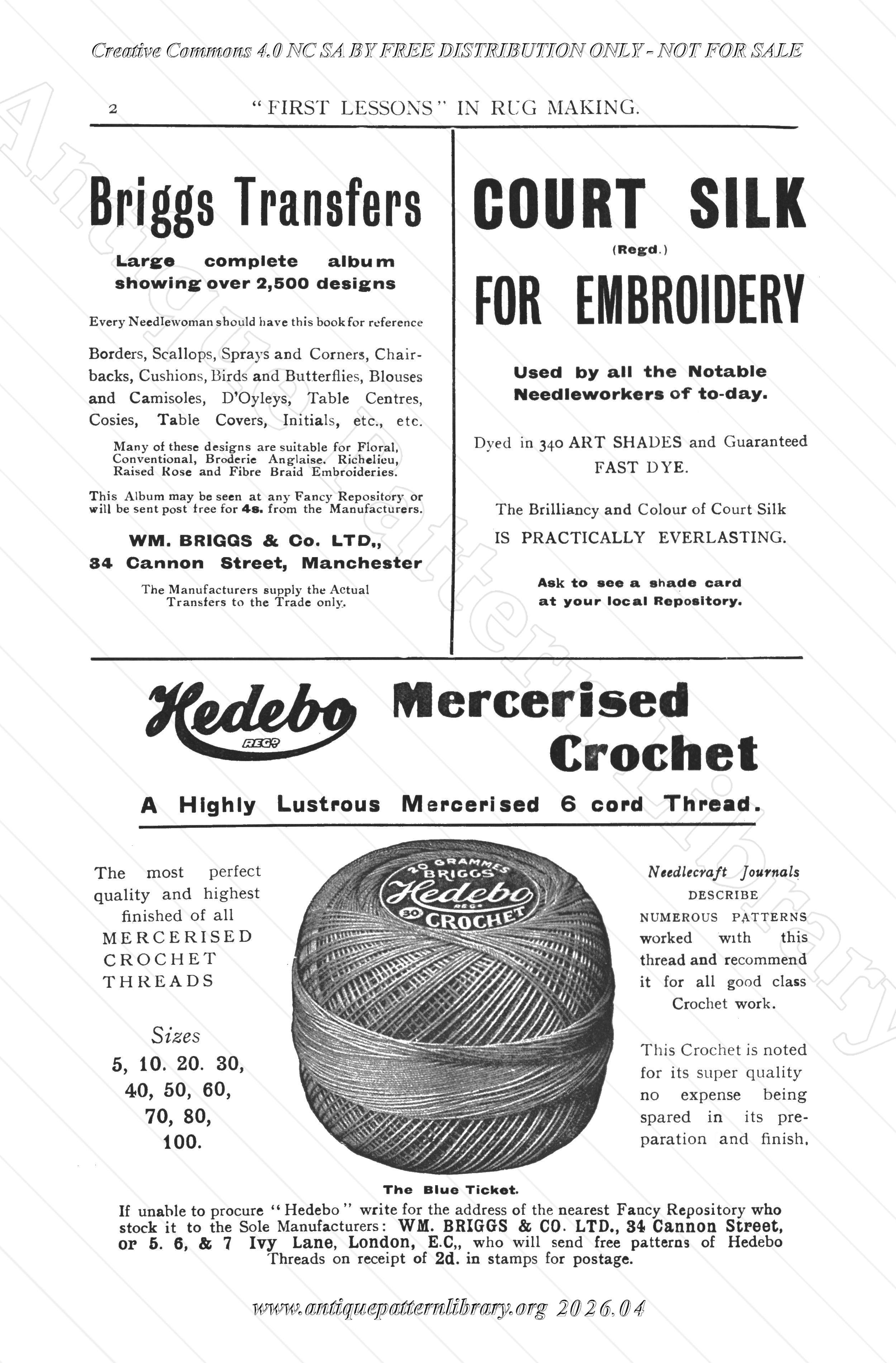 No. 7 in a series of "First Lessons", The Practical Needlework Teacher. Explanations and photos of rug making materials and requisites: canvas, wool, patent rug machine, gauge, lining. Designs: Osmanic, Tauris, Shiraz and Wiltona (all Penelope Rug Designs) and Bokhara. Preparations for Work, Cutting the Wool, Position for Work, and then illustrations of the various design executions as well as colors and sizes.