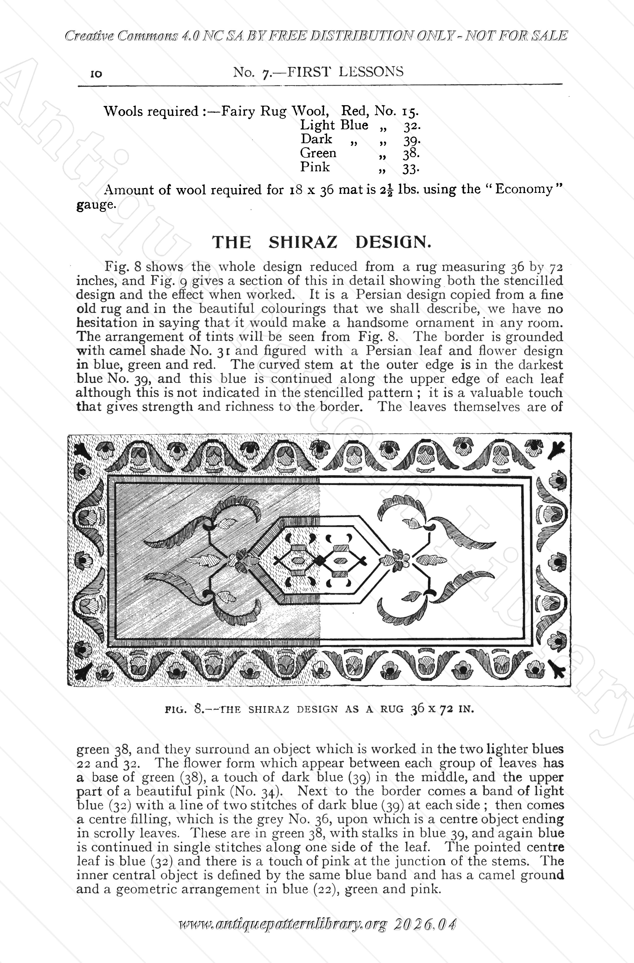 No. 7 in a series of "First Lessons", The Practical Needlework Teacher. Explanations and photos of rug making materials and requisites: canvas, wool, patent rug machine, gauge, lining. Designs: Osmanic, Tauris, Shiraz and Wiltona (all Penelope Rug Designs) and Bokhara. Preparations for Work, Cutting the Wool, Position for Work, and then illustrations of the various design executions as well as colors and sizes.