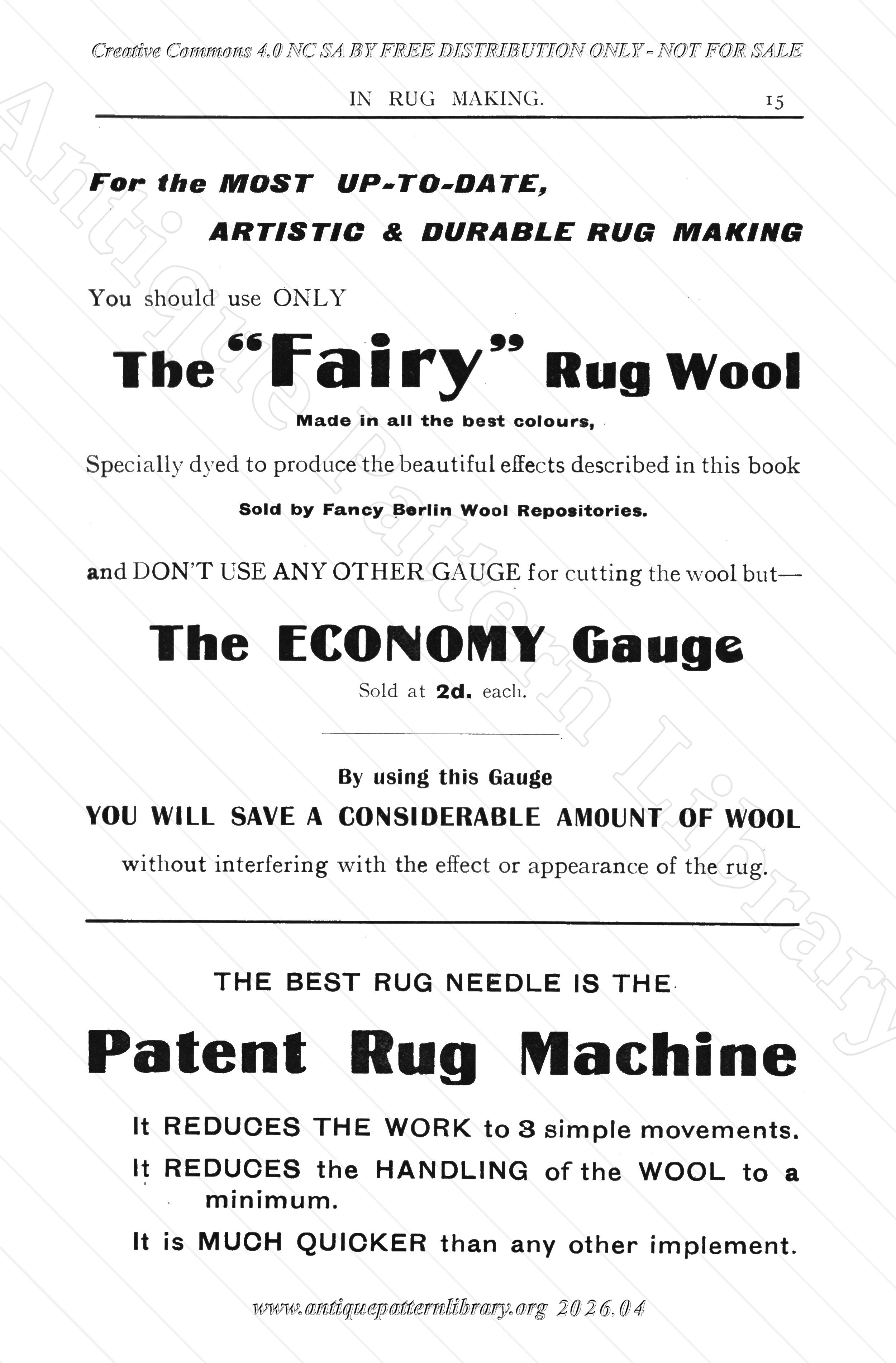 No. 7 in a series of "First Lessons", The Practical Needlework Teacher. Explanations and photos of rug making materials and requisites: canvas, wool, patent rug machine, gauge, lining. Designs: Osmanic, Tauris, Shiraz and Wiltona (all Penelope Rug Designs) and Bokhara. Preparations for Work, Cutting the Wool, Position for Work, and then illustrations of the various design executions as well as colors and sizes.