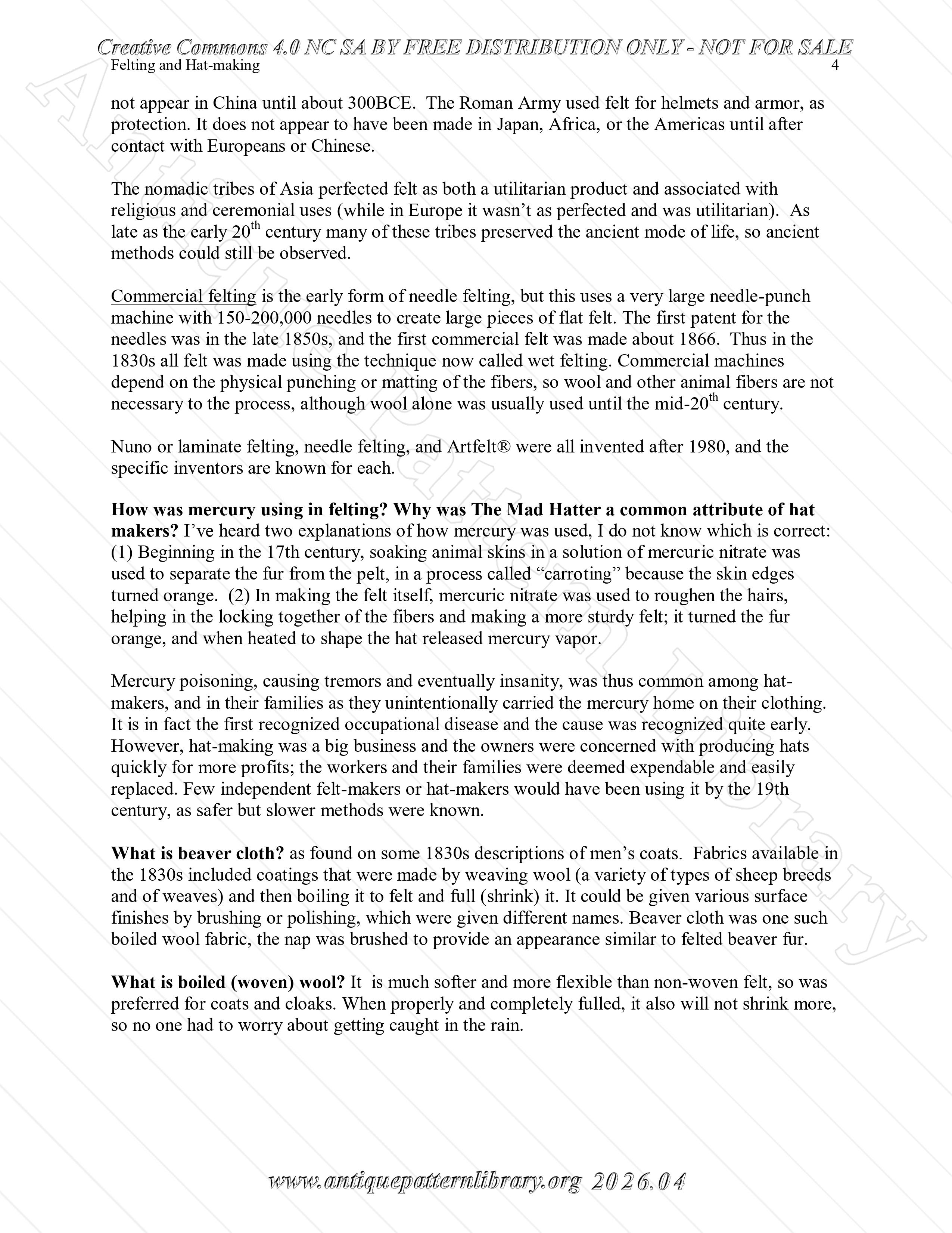 Making felt from wool, small balls, flat piece, hollow objects and then felt hats. Styles, sizes, shaping hats, sewing in sweat band, care of a felt hat. Additionally a note on the 1830s code of hat wearing. Richly illustrated.