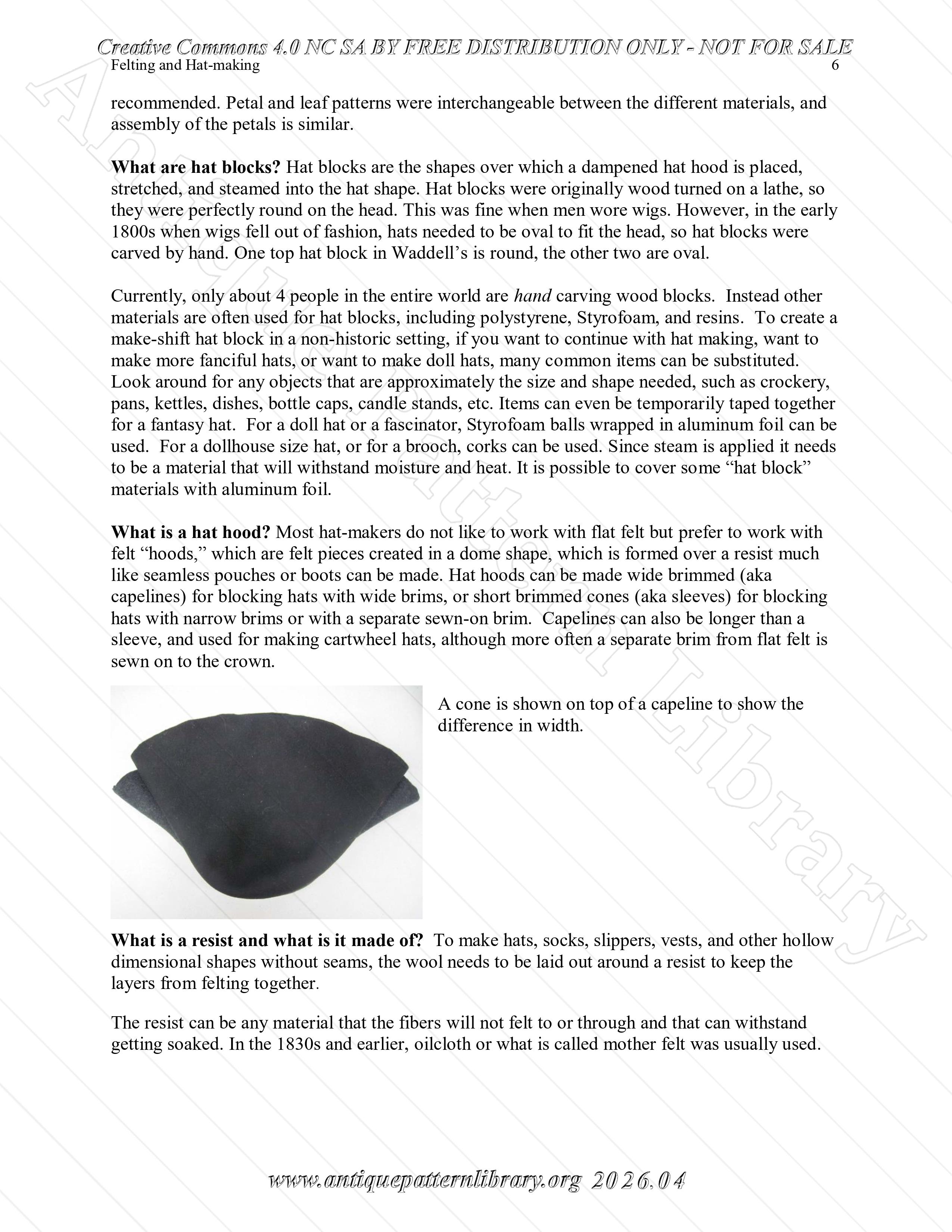 Making felt from wool, small balls, flat piece, hollow objects and then felt hats. Styles, sizes, shaping hats, sewing in sweat band, care of a felt hat. Additionally a note on the 1830s code of hat wearing. Richly illustrated.