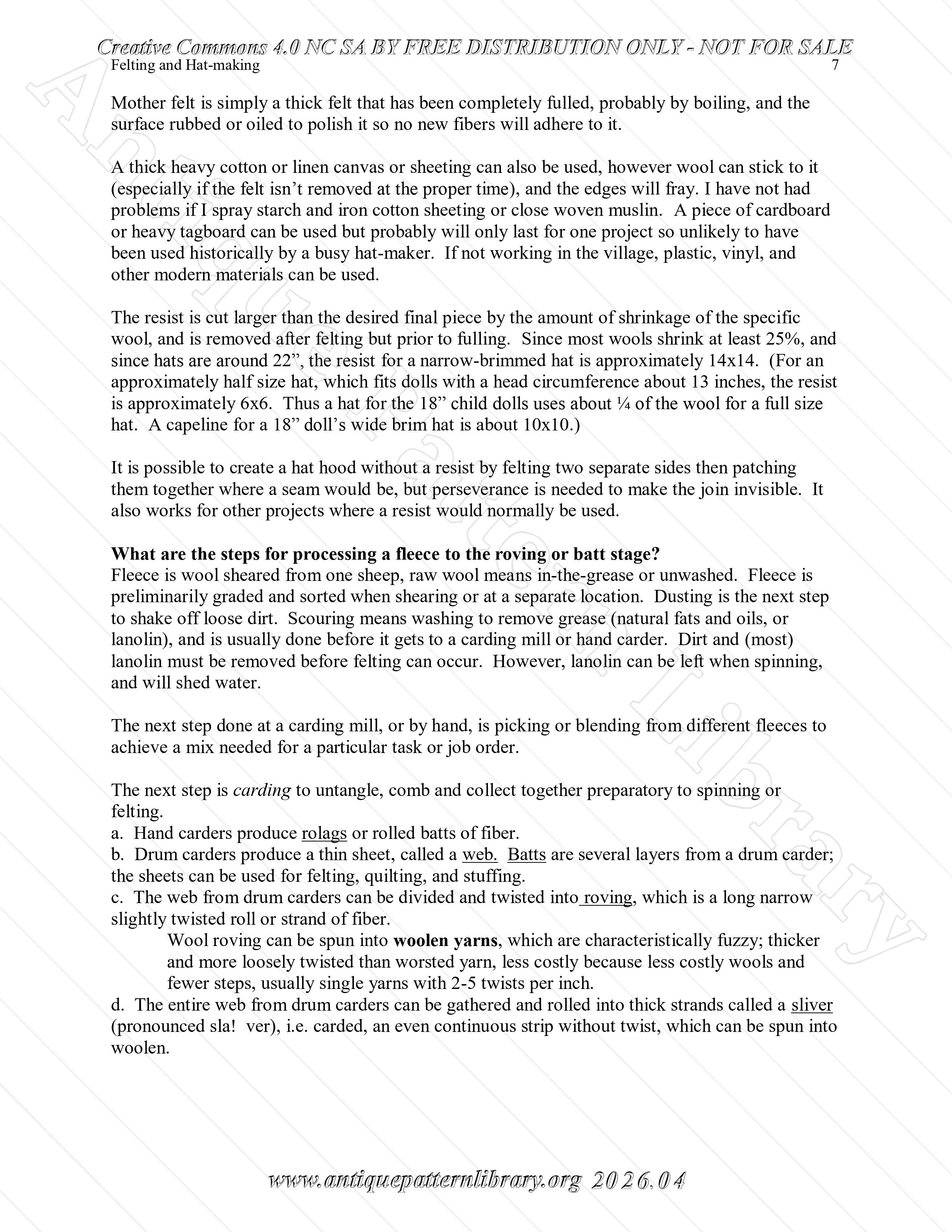 Making felt from wool, small balls, flat piece, hollow objects and then felt hats. Styles, sizes, shaping hats, sewing in sweat band, care of a felt hat. Additionally a note on the 1830s code of hat wearing. Richly illustrated.