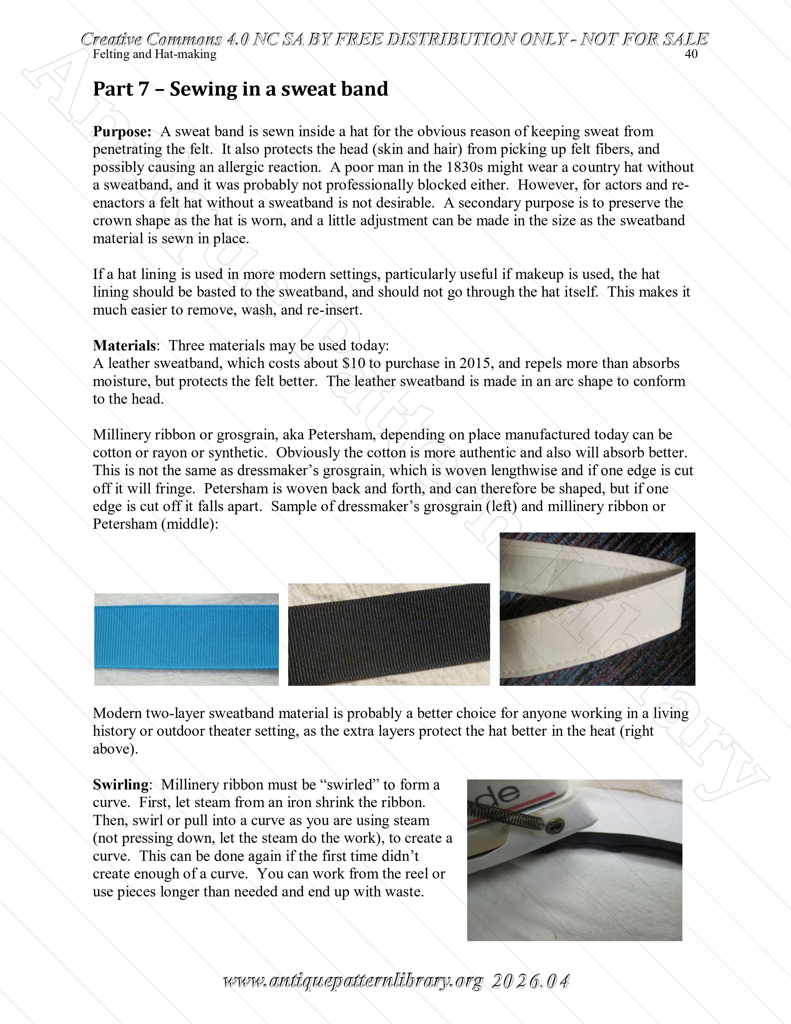 Making felt from wool, small balls, flat piece, hollow objects and then felt hats. Styles, sizes, shaping hats, sewing in sweat band, care of a felt hat. Additionally a note on the 1830s code of hat wearing. Richly illustrated.