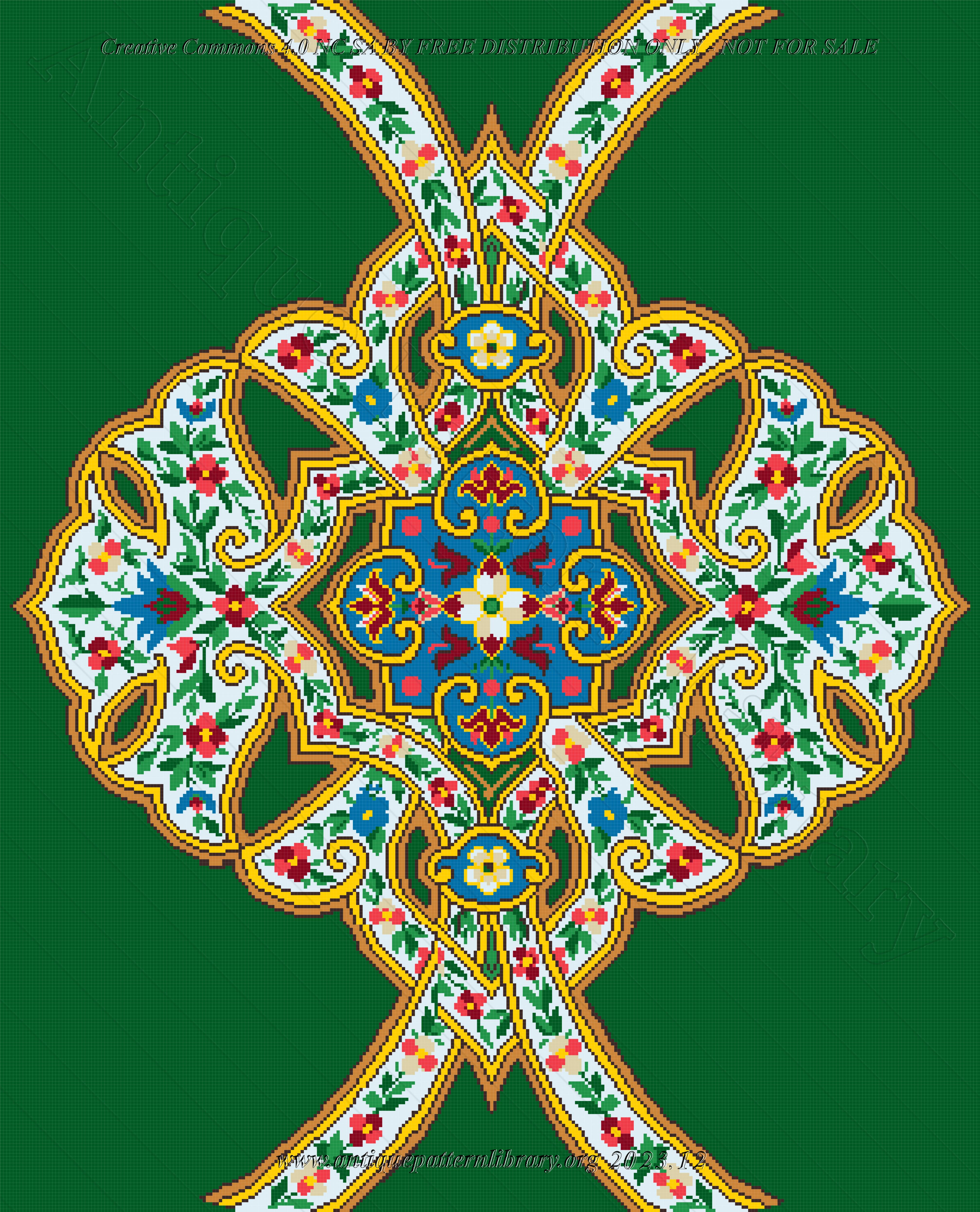Printed pattern, part of a chair seat with a medallion in white, yellow, flowers, outlined in yellow and brown on a green background. Large pattern.