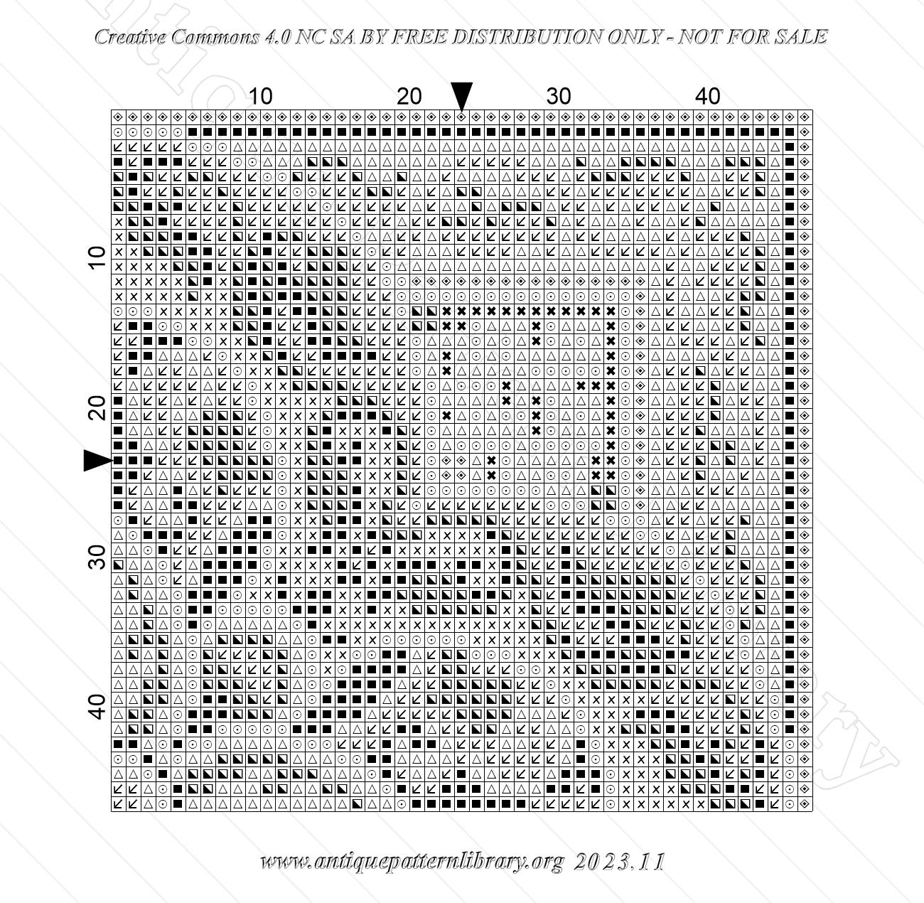 Small embossed and printed pattern on cream cardboard. The pattern is not entirely symmetrical. Some stitches in the chart are not as they are in the original pattern.