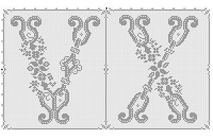 Softcover oblong stapled booklet, 12 pages not including covers. Title in three languages though the origin is not English (plural of pattern is patterns and not pattern's). A single large ornate cross-stitch alphabet with floral decorations. No publisher or date.