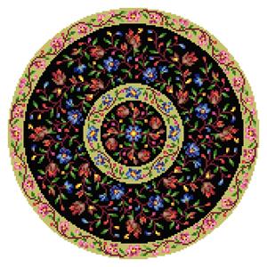 Single sheet quarter circle floral pattern, handpainted on cream cardboard. Two nested circles of muddy green with a stem with small pink and red flowers. Other areas black background, multiple stems with blue, brown, and red flowers. Suitable for a round pillow cover or a table centerpiece. Only two of the prize medals are shown on the pattern instead of the usual four or five.