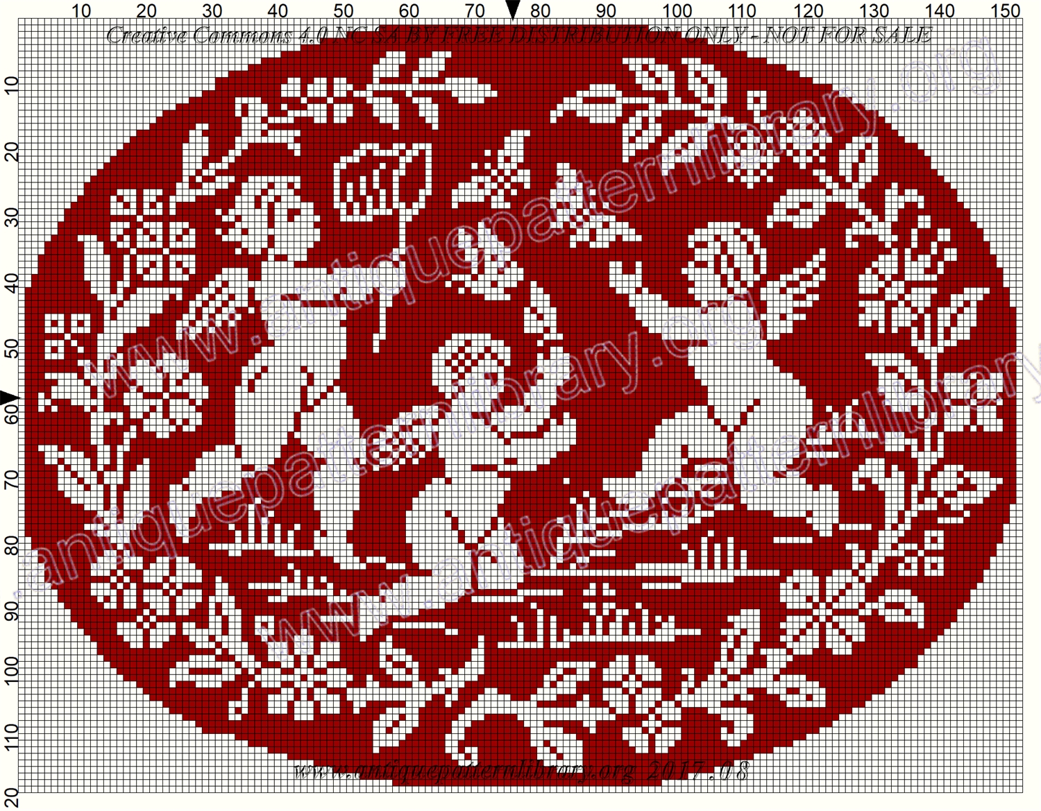 The second Filet Ancient book, printed in 1913. Charted designs for darned net (filet), also useful for filet crochet, cross-stitch, and voided embroidery (Assisi). More strips, insertions, borders, corners, swags, and large motifs. The life of Joan of Arc, heraldic beasts, cherubs; folk tale scenes; cherubs and nymphs; Aesops fables; devotional motifs; Greek and Roman mythic figures; lords and ladies and court life; birds, beasts, flowers, and geometric/scrolling ornament; Night and Day; hunting scenes; procession of the Saints; and more.