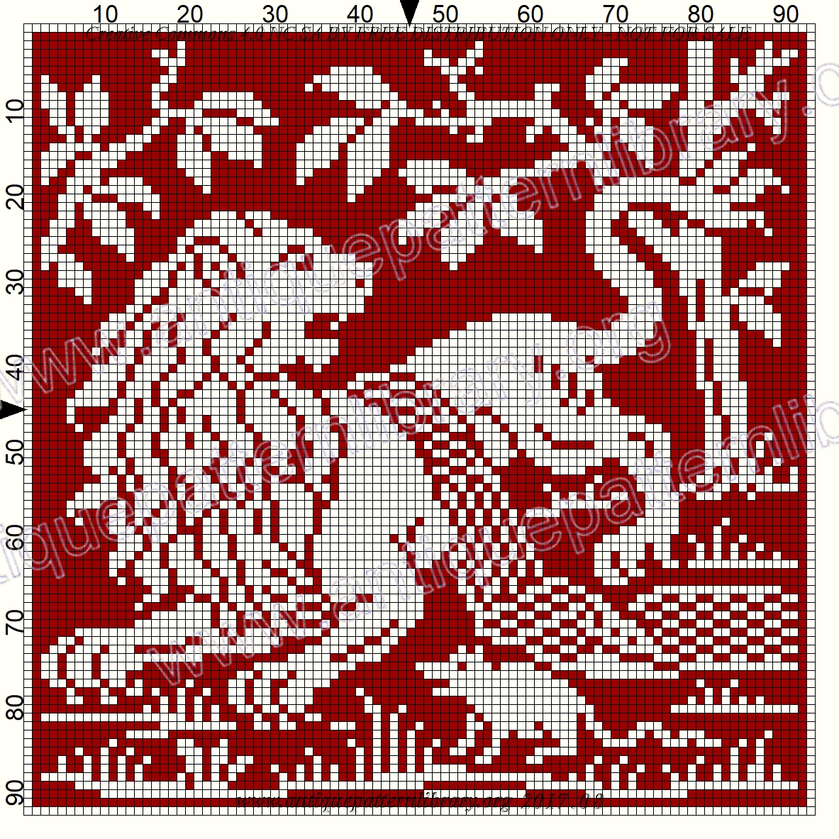 The second Filet Ancient book, printed in 1913. Charted designs for darned net (filet), also useful for filet crochet, cross-stitch, and voided embroidery (Assisi). More strips, insertions, borders, corners, swags, and large motifs. The life of Joan of Arc, heraldic beasts, cherubs; folk tale scenes; cherubs and nymphs; Aesops fables; devotional motifs; Greek and Roman mythic figures; lords and ladies and court life; birds, beasts, flowers, and geometric/scrolling ornament; Night and Day; hunting scenes; procession of the Saints; and more.