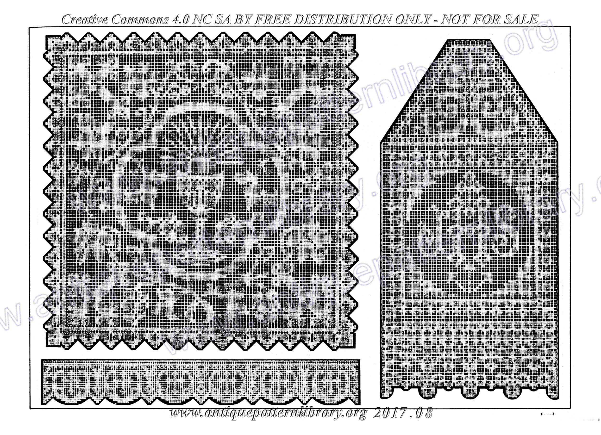 The second Filet Ancient book, printed in 1913. Charted designs for darned net (filet), also useful for filet crochet, cross-stitch, and voided embroidery (Assisi). More strips, insertions, borders, corners, swags, and large motifs. The life of Joan of Arc, heraldic beasts, cherubs; folk tale scenes; cherubs and nymphs; Aesops fables; devotional motifs; Greek and Roman mythic figures; lords and ladies and court life; birds, beasts, flowers, and geometric/scrolling ornament; Night and Day; hunting scenes; procession of the Saints; and more.