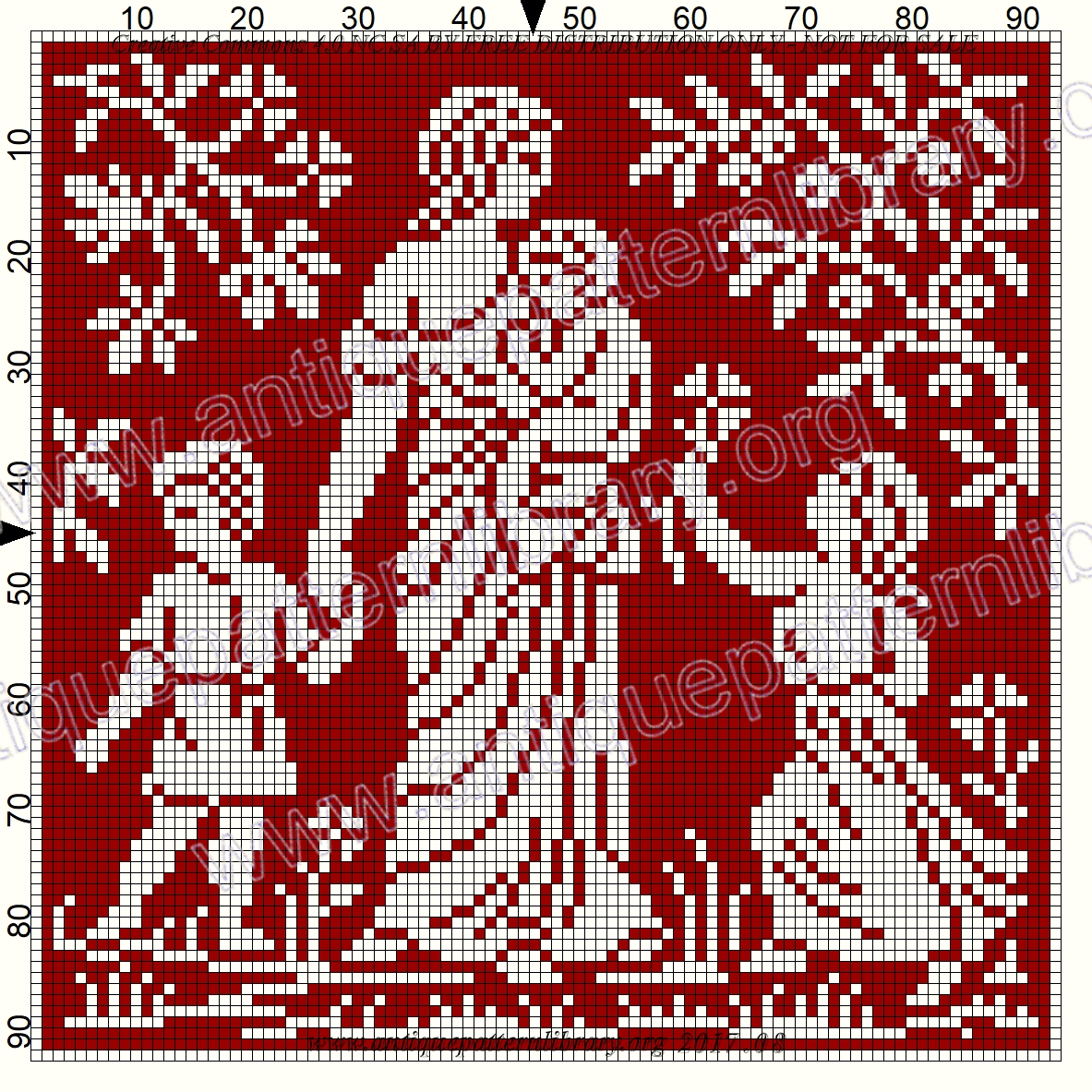 The second Filet Ancient book, printed in 1913. Charted designs for darned net (filet), also useful for filet crochet, cross-stitch, and voided embroidery (Assisi). More strips, insertions, borders, corners, swags, and large motifs. The life of Joan of Arc, heraldic beasts, cherubs; folk tale scenes; cherubs and nymphs; Aesops fables; devotional motifs; Greek and Roman mythic figures; lords and ladies and court life; birds, beasts, flowers, and geometric/scrolling ornament; Night and Day; hunting scenes; procession of the Saints; and more.