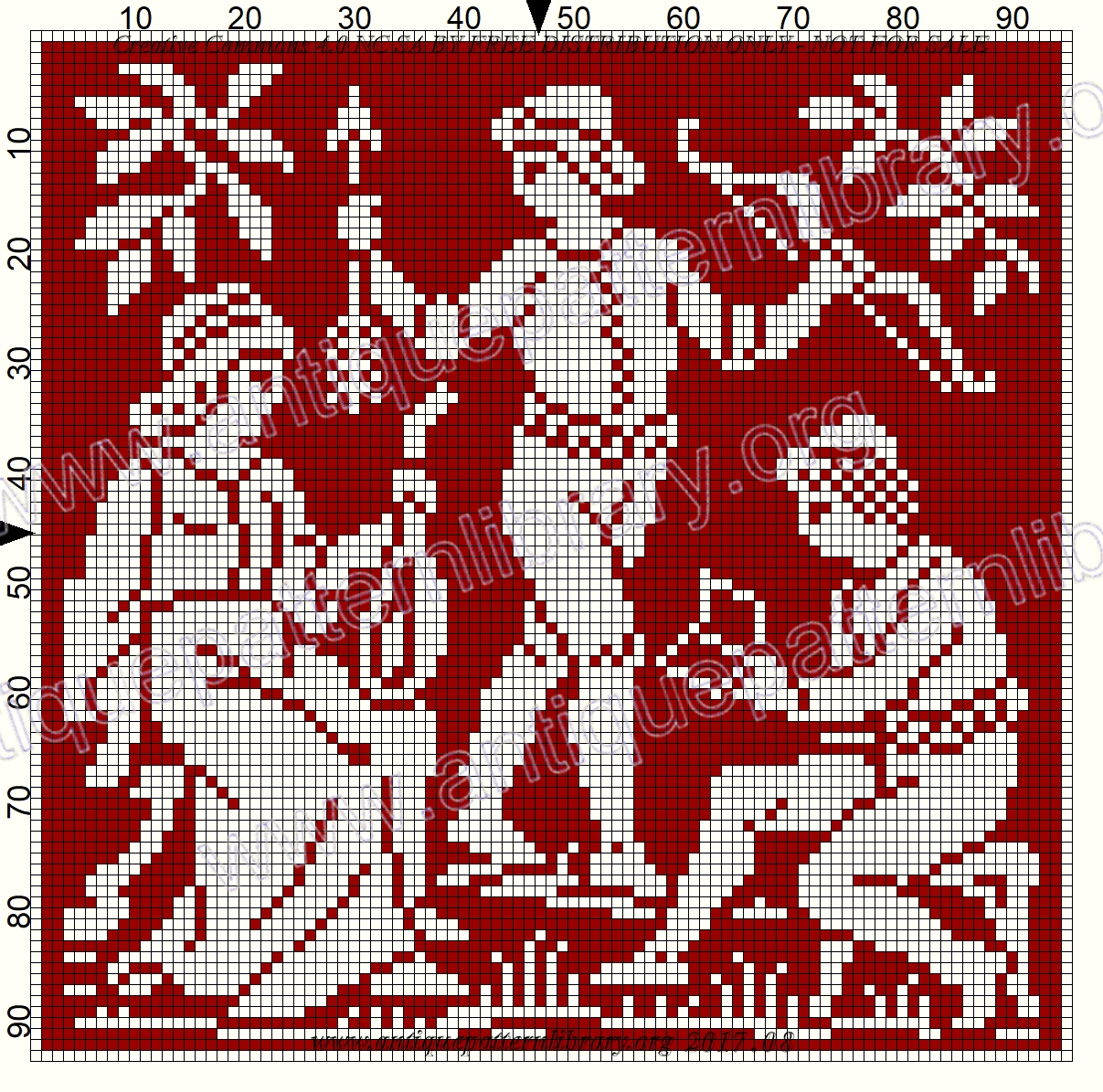 The second Filet Ancient book, printed in 1913. Charted designs for darned net (filet), also useful for filet crochet, cross-stitch, and voided embroidery (Assisi). More strips, insertions, borders, corners, swags, and large motifs. The life of Joan of Arc, heraldic beasts, cherubs; folk tale scenes; cherubs and nymphs; Aesops fables; devotional motifs; Greek and Roman mythic figures; lords and ladies and court life; birds, beasts, flowers, and geometric/scrolling ornament; Night and Day; hunting scenes; procession of the Saints; and more.