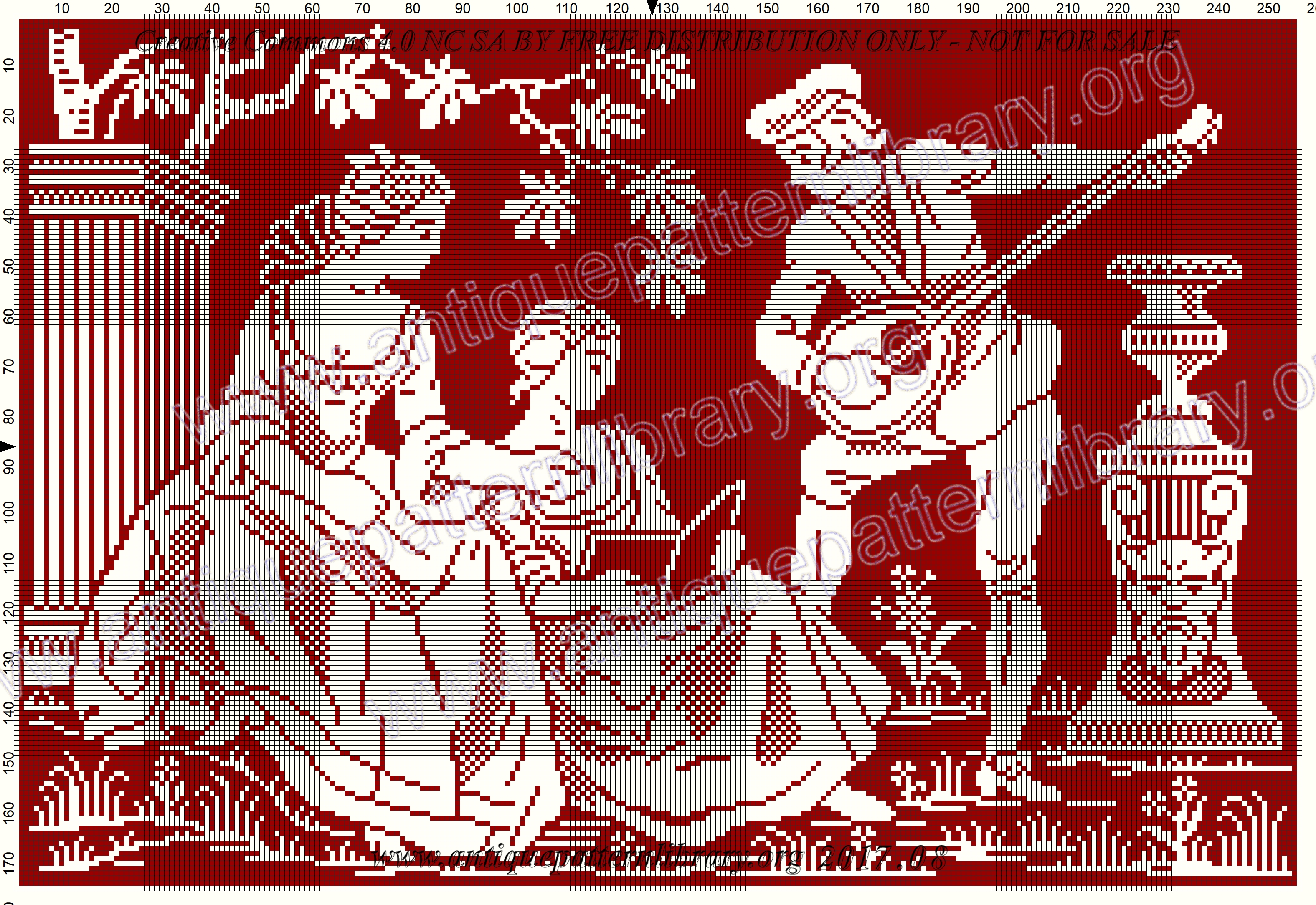 The second Filet Ancient book, printed in 1913. Charted designs for darned net (filet), also useful for filet crochet, cross-stitch, and voided embroidery (Assisi). More strips, insertions, borders, corners, swags, and large motifs. The life of Joan of Arc, heraldic beasts, cherubs; folk tale scenes; cherubs and nymphs; Aesops fables; devotional motifs; Greek and Roman mythic figures; lords and ladies and court life; birds, beasts, flowers, and geometric/scrolling ornament; Night and Day; hunting scenes; procession of the Saints; and more.