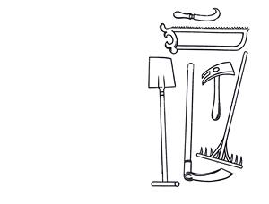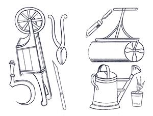 Small booklet, 16 pages of examples to draw on a blackboard. Volume 6, images of garden- and agricultural tools and vehicles. The drawings were white on black; for the sake of clarity the colors have been reversed.