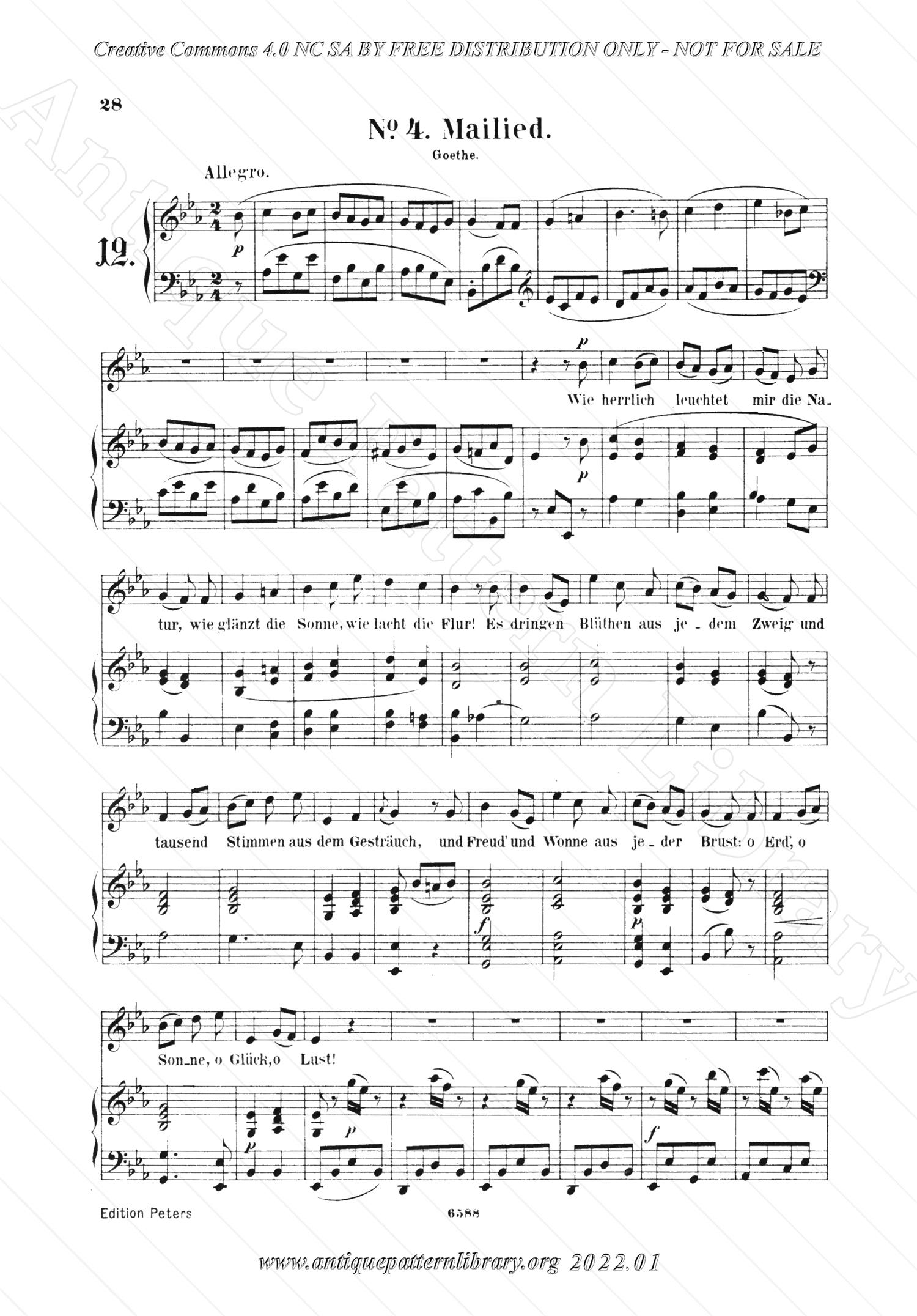 Hardcover bound book, 188 pages of music, 67 songs for voice and piano. Revised by Alfred Dörffel. Published by C.F. Peters in Leipzig, a famous and still-existing music publishing company, as part of their even more well-known Edition Peters series. No date mentioned, but most likely before 1920. The style of the cover and title page still occurs in 1915.
