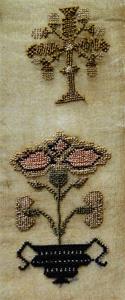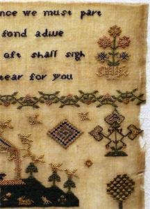 Sampler embroidered with wool and silk (judging from the gleam on the photographs) on linen. Top is an inscription with two potted flowers: A long farewell since we must part / Receive my fond adieu / Believe me Mary I oft shall sigh / And drop A tear for you. A floral border and then a symmetrical bottom part with trees, flowers, small animals, and an elaborate building on top of a hill, with trees with each its own bird at the side, and a vessel with a flame inside the building.