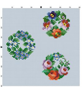 Fragment of a Berlin woolwork pattern, handpainted on grey cardboard. Three small motifs of flower garlands, each approximately 30 by 30 stitches. One of forget-me-nots, one of three roses and some forget-me-nots, and one of undetermined flowers in red, pink, and blue.