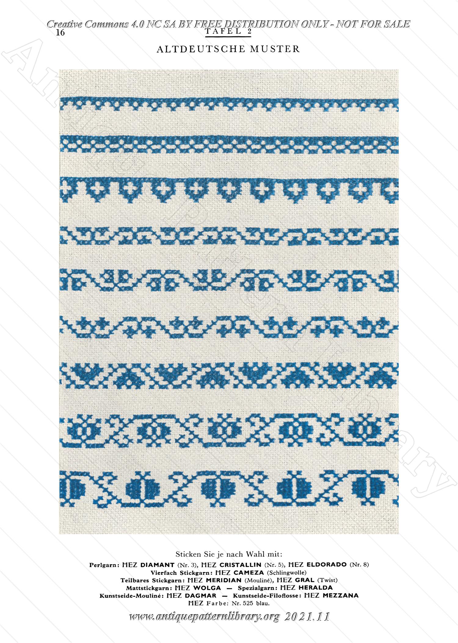 Softcover book, 90 numbered pages. Short description of how-to execute different cross-stitch variations and then 68 color plates of antique cross-stitch patterns newly executed. Some close-ups and charts included. Pattern sheets were to be sold separately and are not present here.
