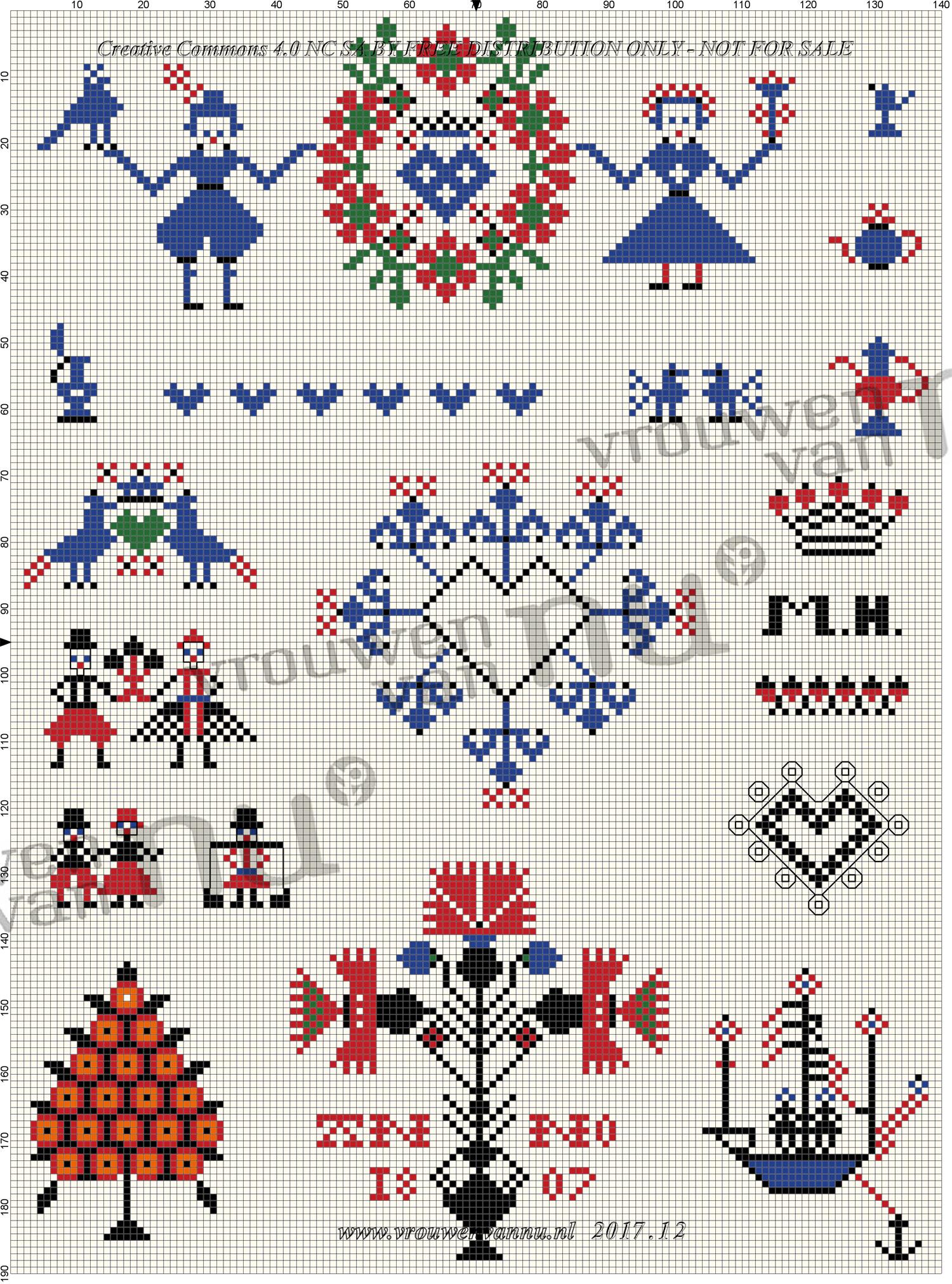 24 plates of Dutch folk art motifs, including 12 plates of cross stitch motifs taken from antique samplers. The others show cookie shapes, bent iron work, and other surface and withdrawn thread/darned embroidery and cutwork embroidery patterns from clothes. The flyer announcing the intial pulbication is also included.