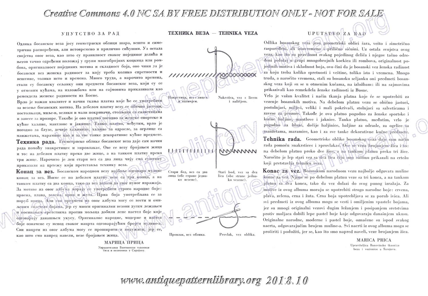 Bosnian(?) language booklet in Cyrilic and Latin scrips, with 8 pages and 32multicolor charted embroidery motifs for cross-stitch trims on traditional linens and dress. Also includes limited working instructions. Borders, spot motifs, and corners. Minor mouse-damage to page edges.