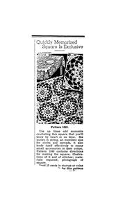 Twelve advertisements for patterns for crochet, filet crochet, curtains, braided rugs, embroidery and one whatnot made of wooden thread spools. Various designers and publishers; one actual cross-stitch pattern probably from a German pattern book or magazine.