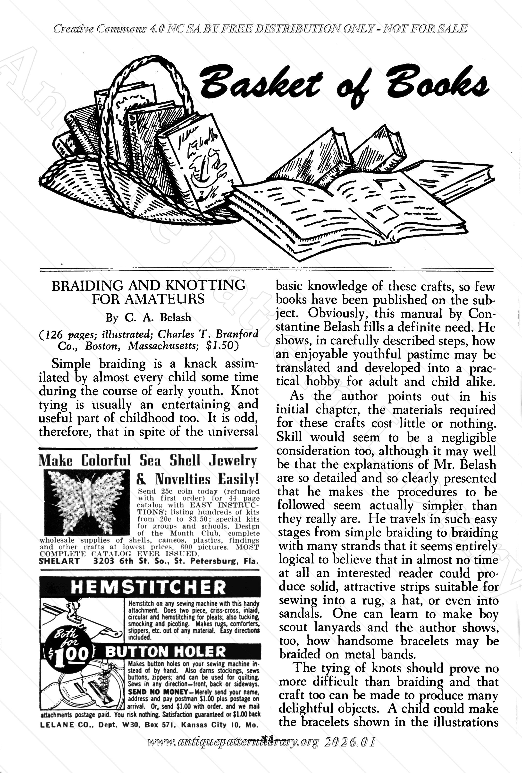 Crochet: Buffet Runner, Round Table Doily in pineapple design, Mrs Stokes crocheted handkerchief edgings, Daisy Hot Plate Mat Cover, Small Round Curtain Pull, Lounging Slippers. Knitting: Knitted Lace Edging. Hairpin Lace: Handkerchief Edge (with crochet). Embroidery: Huck Weaving, St. Pat's Colleen. Tatting: Tatted Dress Ornament for shoulder. Commercial suggestions: Growing Guinea Fowl, decorating cactus pots, sewing slippers. Aunt Ellen's Club Notes: History of lilies. Cooking: Southern Upside Down Dinner, Lima Bean Sausages, Baked Noodles and Tuna Fish, Hungarian Stuffed Cabbage