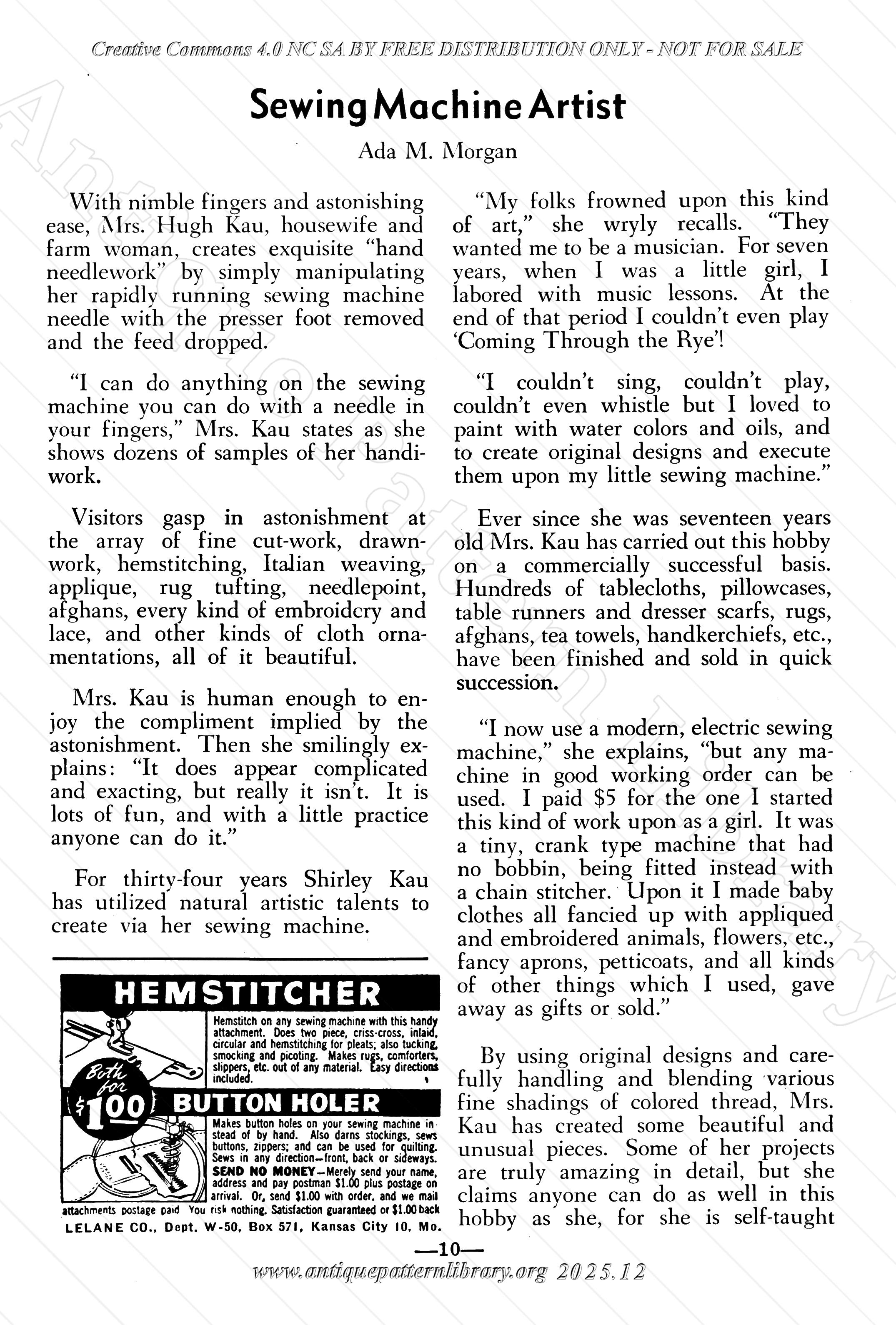 Five-Piece Tatted Luncheon Set. Crochet: Star Dresser Scarf. Sewing Machine Artist Mrs. Hugh Kau. Aunt Ellen's Club Notes: Folk Songs and Ballads. Recipe: Maybasket Cup Cake. Crochet: A Hat in Lacy Crocheting. Recipes: Hot Potato Salad, Pineapple Salad, Cabbage and Apple Salad, Stuffed Orange Halves, Frozen Fruit Salad. Crochet: Pincushion, Crocheted Bib, Snowflake Coaster, Table Scarf, Child's Crocheted Dress. Knitting: Zig Zag Ribbing. Crochet: Bedspread Motif, Flower Edge. Embroidery: Miss May. Sewing: Hints on Sewing Nylon Material.