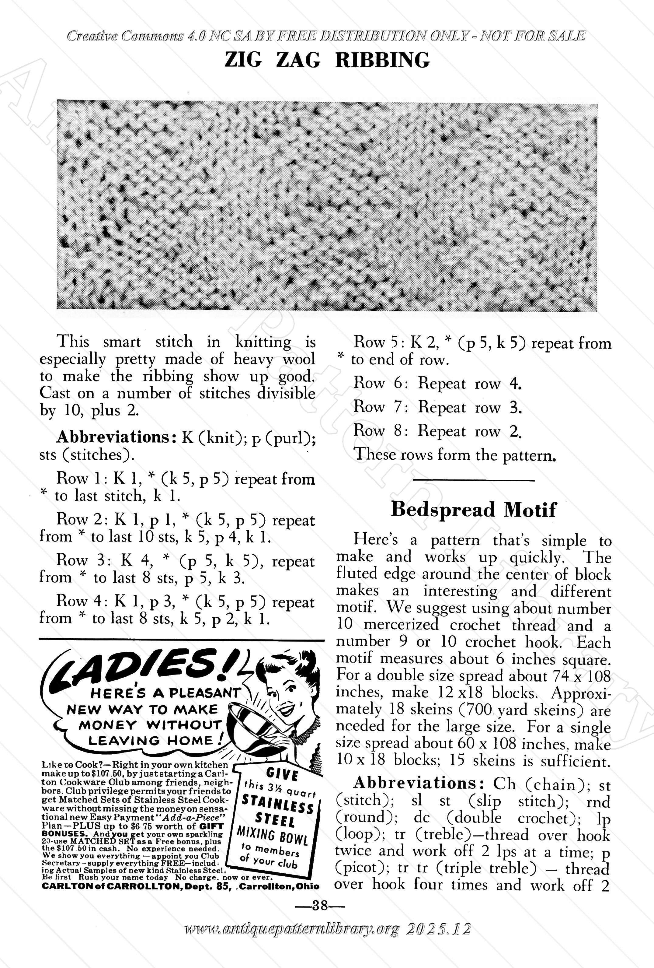 Five-Piece Tatted Luncheon Set. Crochet: Star Dresser Scarf. Sewing Machine Artist Mrs. Hugh Kau. Aunt Ellen's Club Notes: Folk Songs and Ballads. Recipe: Maybasket Cup Cake. Crochet: A Hat in Lacy Crocheting. Recipes: Hot Potato Salad, Pineapple Salad, Cabbage and Apple Salad, Stuffed Orange Halves, Frozen Fruit Salad. Crochet: Pincushion, Crocheted Bib, Snowflake Coaster, Table Scarf, Child's Crocheted Dress. Knitting: Zig Zag Ribbing. Crochet: Bedspread Motif, Flower Edge. Embroidery: Miss May. Sewing: Hints on Sewing Nylon Material.