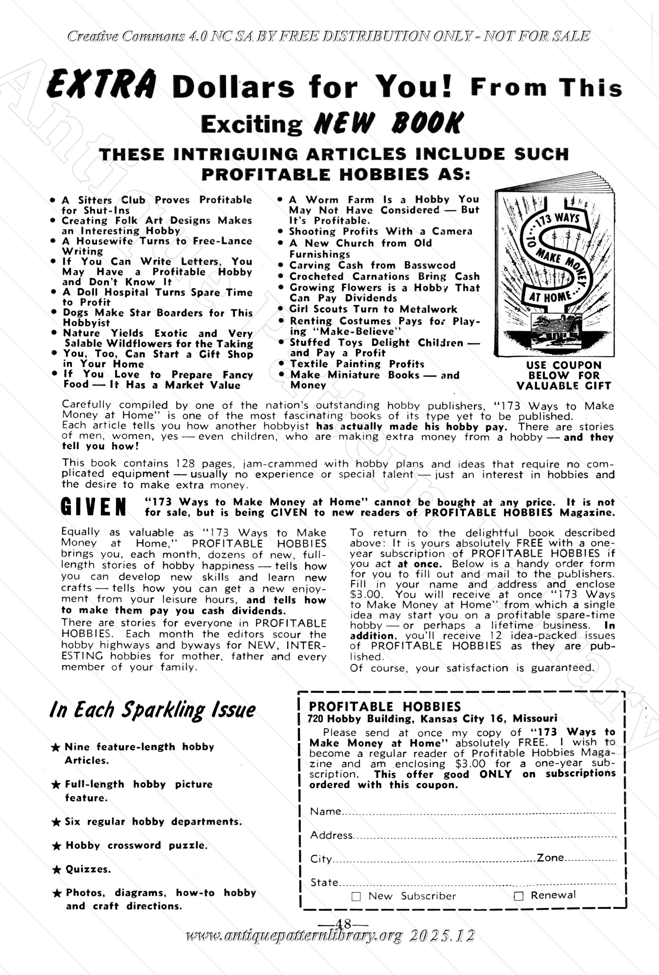 Five-Piece Tatted Luncheon Set. Crochet: Star Dresser Scarf. Sewing Machine Artist Mrs. Hugh Kau. Aunt Ellen's Club Notes: Folk Songs and Ballads. Recipe: Maybasket Cup Cake. Crochet: A Hat in Lacy Crocheting. Recipes: Hot Potato Salad, Pineapple Salad, Cabbage and Apple Salad, Stuffed Orange Halves, Frozen Fruit Salad. Crochet: Pincushion, Crocheted Bib, Snowflake Coaster, Table Scarf, Child's Crocheted Dress. Knitting: Zig Zag Ribbing. Crochet: Bedspread Motif, Flower Edge. Embroidery: Miss May. Sewing: Hints on Sewing Nylon Material.