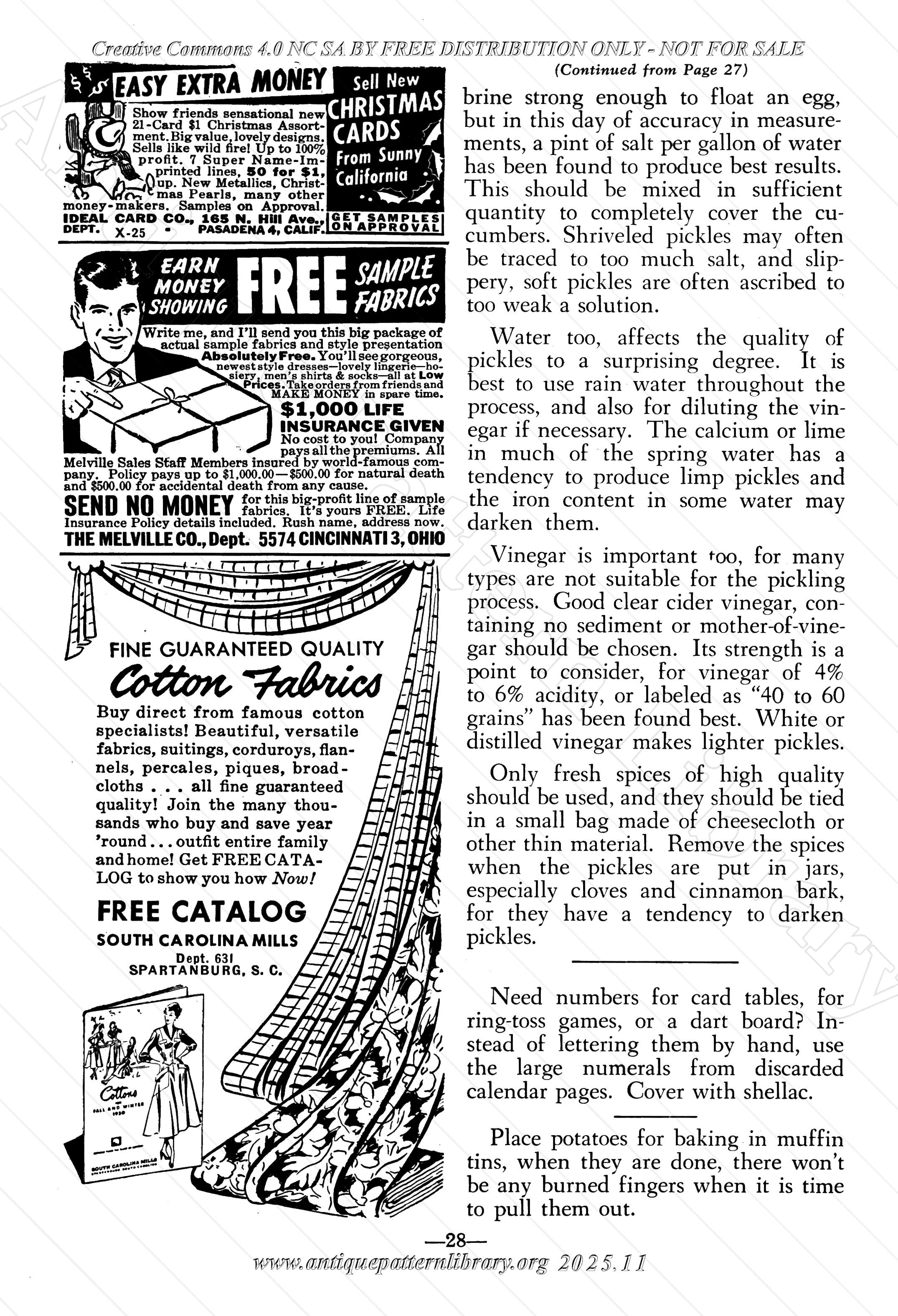 Crochet: Tablecloth with square motifs. Knitting: Knitted Mittens with kitten design on the back, Carriage Robe matching the three-piece baby set in Vol. 15 No. 11. Crochet: Radio Scarf. Painting: New Faces for Old Furnishings, painting motifs on furniture items. Crochet: Star Fish Centerpiece. Women Who Make Cents: Colorizing photographs, sewing stuffed terry cloth toys. Aunt Ellen's Club Notes: Drying Fruits and Vegetables. Crochet: Cochet An Edge for Your Handkerchief. Tatting: Tatted Flower Edge. Cooking: Recipe for Tomato Catsup, Like-Heinz Sweet Pickles, Grandmother's Chili Sauce, Tips for the Pickling Season. Crochet: Matching Sunflower Set of hot plate mat and pan holder. Craft: Shellcraft, making jewelry from shells. Filet Crochet: Crocheted Initials. Painting: Painting Family History on China. Knitting: Knitted Rug. Filet Crochet: Flower Basket Chair Set. Embroidery: School Boy.