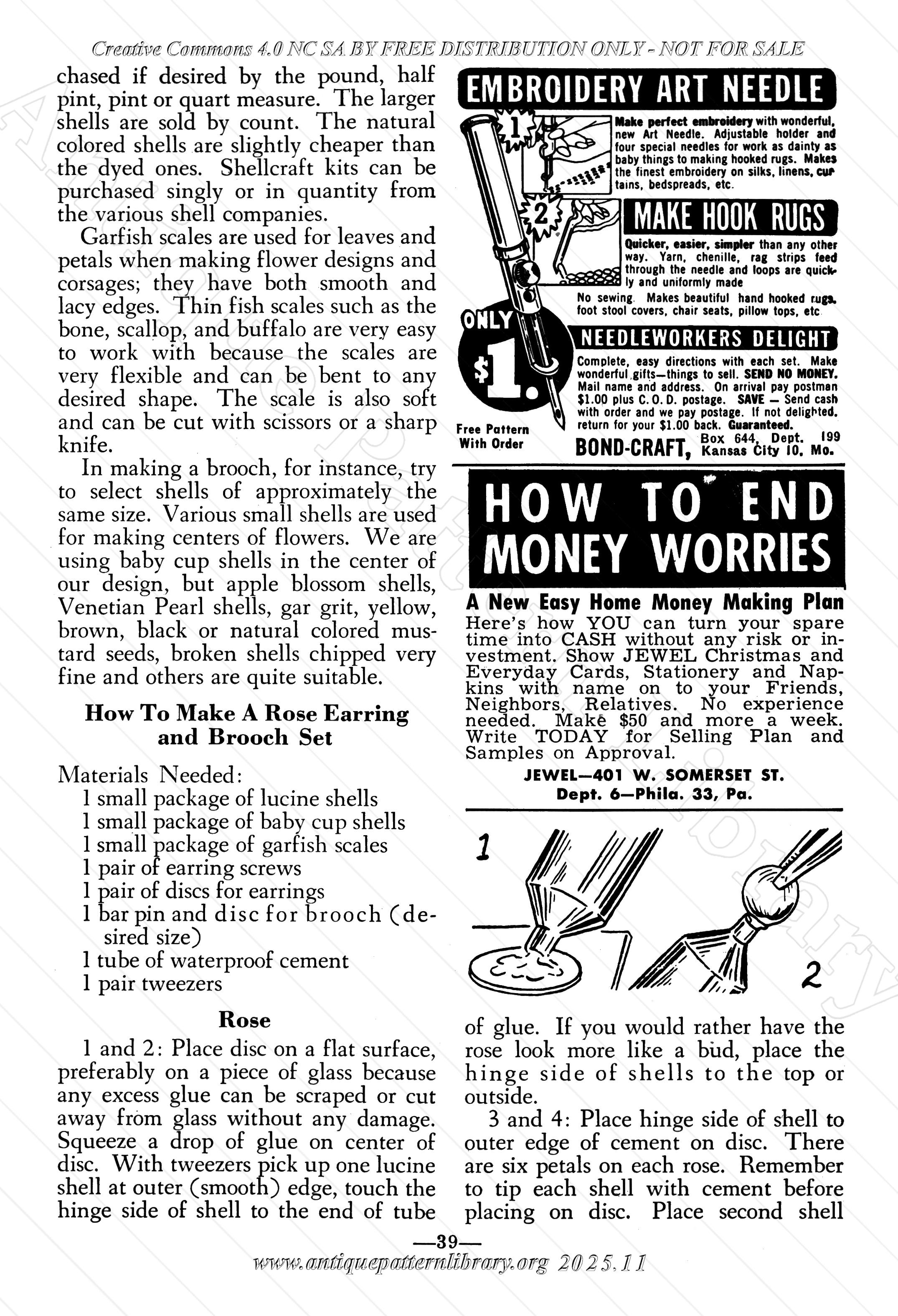 Crochet: Tablecloth with square motifs. Knitting: Knitted Mittens with kitten design on the back, Carriage Robe matching the three-piece baby set in Vol. 15 No. 11. Crochet: Radio Scarf. Painting: New Faces for Old Furnishings, painting motifs on furniture items. Crochet: Star Fish Centerpiece. Women Who Make Cents: Colorizing photographs, sewing stuffed terry cloth toys. Aunt Ellen's Club Notes: Drying Fruits and Vegetables. Crochet: Cochet An Edge for Your Handkerchief. Tatting: Tatted Flower Edge. Cooking: Recipe for Tomato Catsup, Like-Heinz Sweet Pickles, Grandmother's Chili Sauce, Tips for the Pickling Season. Crochet: Matching Sunflower Set of hot plate mat and pan holder. Craft: Shellcraft, making jewelry from shells. Filet Crochet: Crocheted Initials. Painting: Painting Family History on China. Knitting: Knitted Rug. Filet Crochet: Flower Basket Chair Set. Embroidery: School Boy.