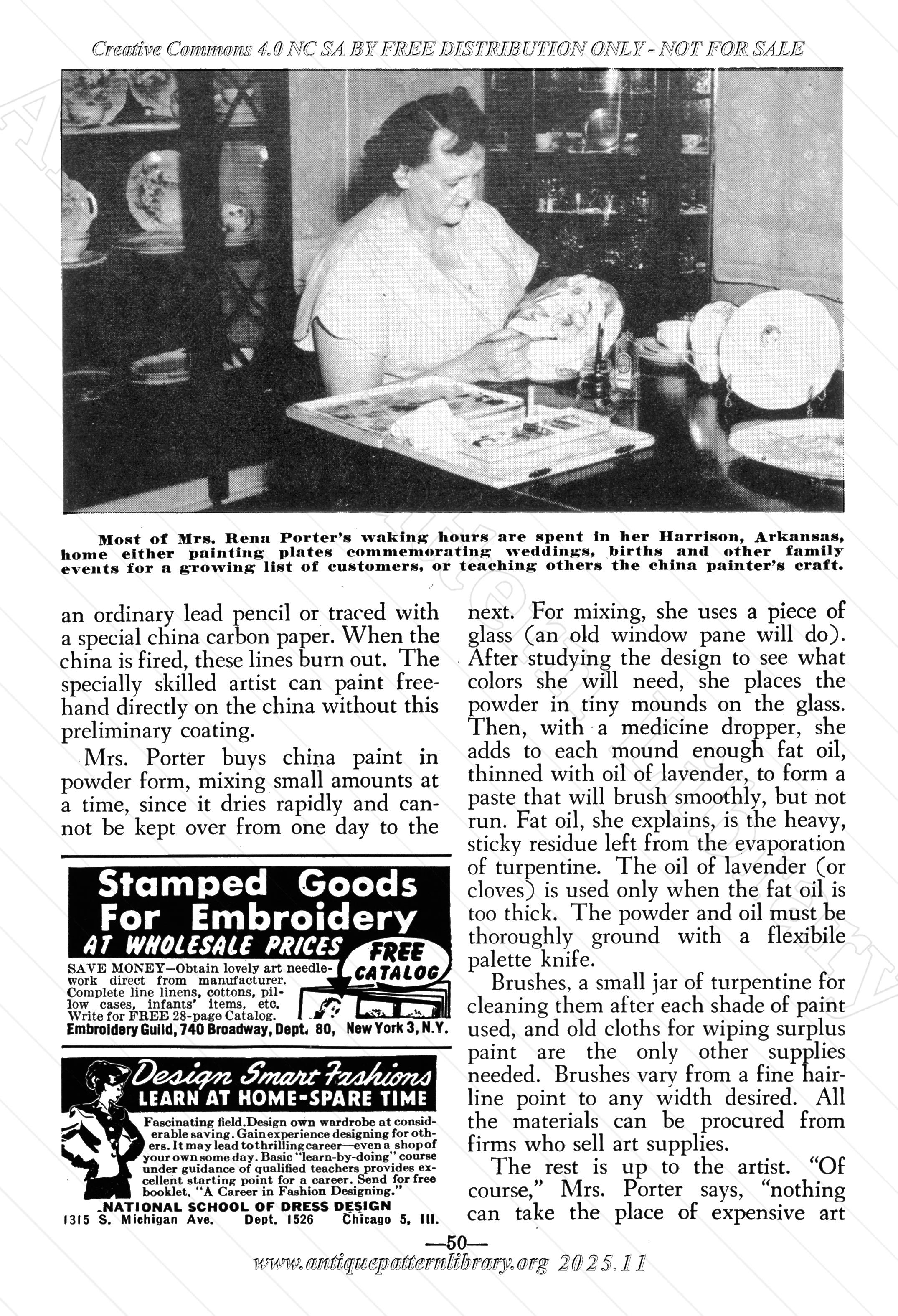 Crochet: Tablecloth with square motifs. Knitting: Knitted Mittens with kitten design on the back, Carriage Robe matching the three-piece baby set in Vol. 15 No. 11. Crochet: Radio Scarf. Painting: New Faces for Old Furnishings, painting motifs on furniture items. Crochet: Star Fish Centerpiece. Women Who Make Cents: Colorizing photographs, sewing stuffed terry cloth toys. Aunt Ellen's Club Notes: Drying Fruits and Vegetables. Crochet: Cochet An Edge for Your Handkerchief. Tatting: Tatted Flower Edge. Cooking: Recipe for Tomato Catsup, Like-Heinz Sweet Pickles, Grandmother's Chili Sauce, Tips for the Pickling Season. Crochet: Matching Sunflower Set of hot plate mat and pan holder. Craft: Shellcraft, making jewelry from shells. Filet Crochet: Crocheted Initials. Painting: Painting Family History on China. Knitting: Knitted Rug. Filet Crochet: Flower Basket Chair Set. Embroidery: School Boy.