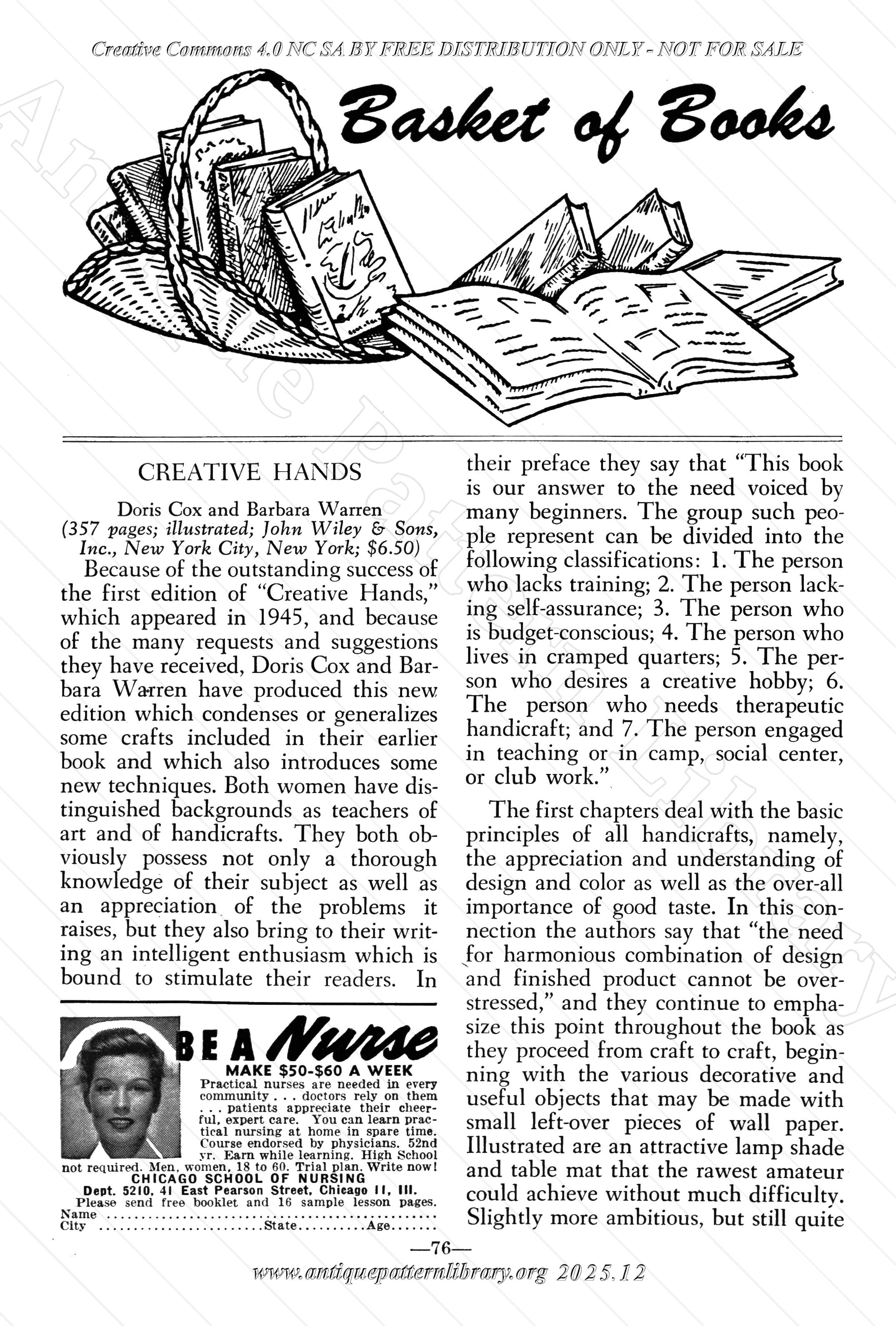 Embroidery: Cross Stitch Rug with astrological symbols, Knitting: Infants' 3-Piece Set, bonnet, jacket, booties. Crochet: Flower Earrings, Ruffle Doily. Paper: Crepe Paper Rope Craft. Crochet: Corner Edging, Terry Cloth Laundry Bag, Aunt Ellen's Club Notes, Christmas Party in October. Recipes: Sweet Potato Pudding, Harvest Punch, Apple Cup Cakes, hamburgers. Crochet: Versatile (round) Medallion. Tatting: tatting and lace edge. Ribbonwork: Clock Book Mark. Leathercraft: stitching, bookmark, belt. Embroidery: Autumn Queen. Bookbinding: Binding Workbaskets. Dollmaking: Apple Granny Dolls. Crochet: Square Doily. Sewing: Various Kinds of Edge Finishes.