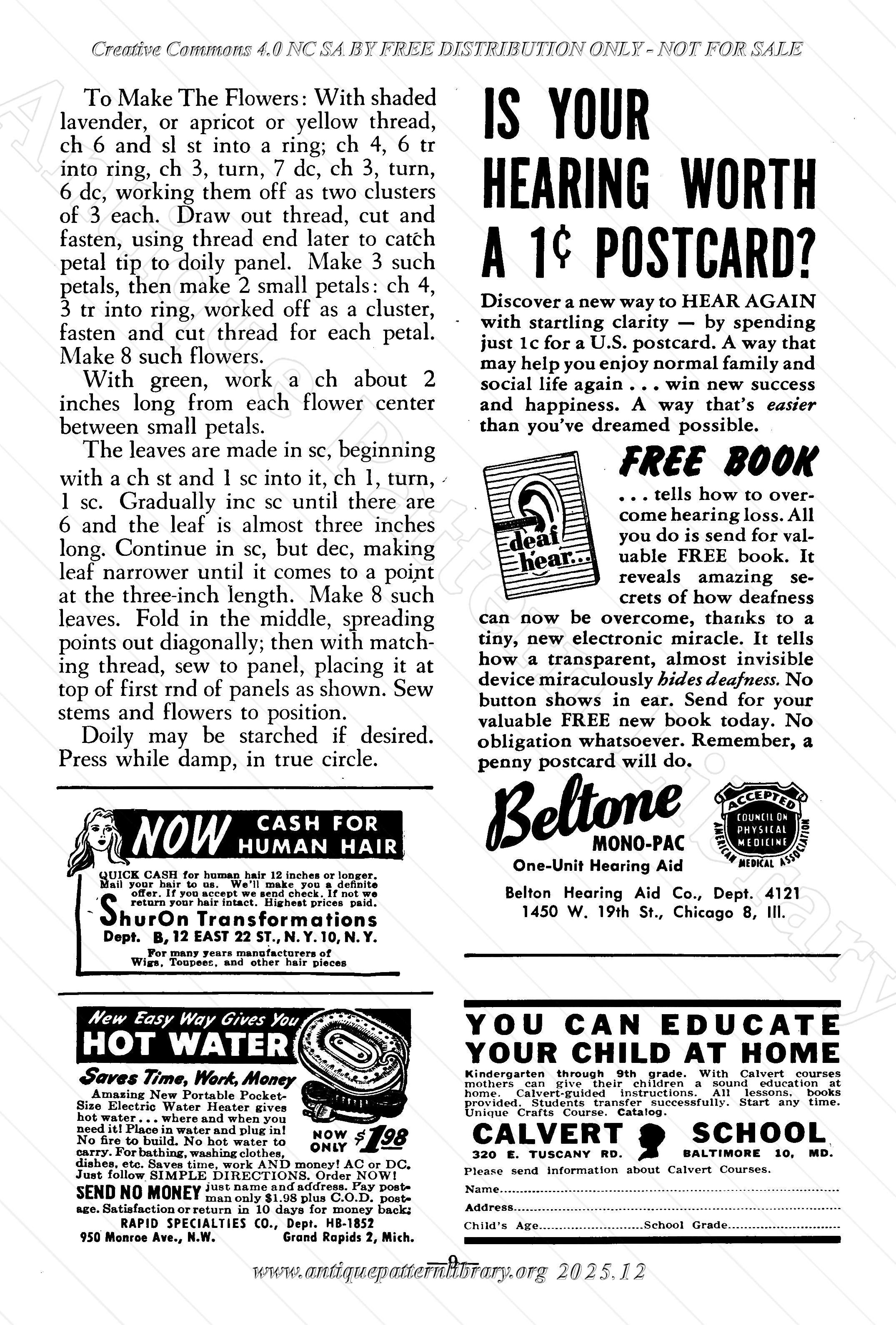 How to make a crocheted place mat, attractive Pansy Pan Holder, crocheted Sandals. Also, filet crochet handkerchief trim with a tatted edge, crocheted Iris and Cross Doily, Two Color Knitted Mat, Cardigan in Crochet, Make Your (hooked) Rugs, explanation about US beef grades, recipe for Beef Stew. Aunt Ellen's Club Notes: article about the organization of Bake Sales as a way of making money. Hat making: small hats out of big ones. Tatted Doily (actually tatted edging around linen circle. Crochet: Dresser Scarf with Butterfly Trim. Some Knitting Tips, Stitching Names on Shirts, Knitting for Tots, Crocheted Insertion for Baby, another Filet Corner Handkerchief Trim. Sewing: Apron made from handkerchiefs, an article about Hemstitching by hand, and so many advertisements!