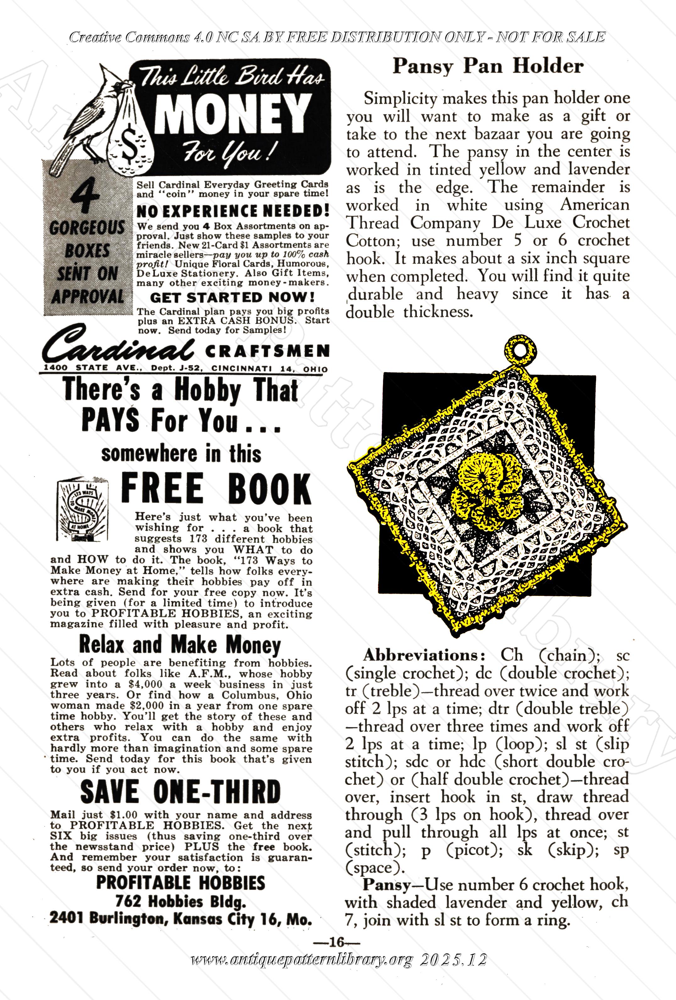 How to make a crocheted place mat, attractive Pansy Pan Holder, crocheted Sandals. Also, filet crochet handkerchief trim with a tatted edge, crocheted Iris and Cross Doily, Two Color Knitted Mat, Cardigan in Crochet, Make Your (hooked) Rugs, explanation about US beef grades, recipe for Beef Stew. Aunt Ellen's Club Notes: article about the organization of Bake Sales as a way of making money. Hat making: small hats out of big ones. Tatted Doily (actually tatted edging around linen circle. Crochet: Dresser Scarf with Butterfly Trim. Some Knitting Tips, Stitching Names on Shirts, Knitting for Tots, Crocheted Insertion for Baby, another Filet Corner Handkerchief Trim. Sewing: Apron made from handkerchiefs, an article about Hemstitching by hand, and so many advertisements!