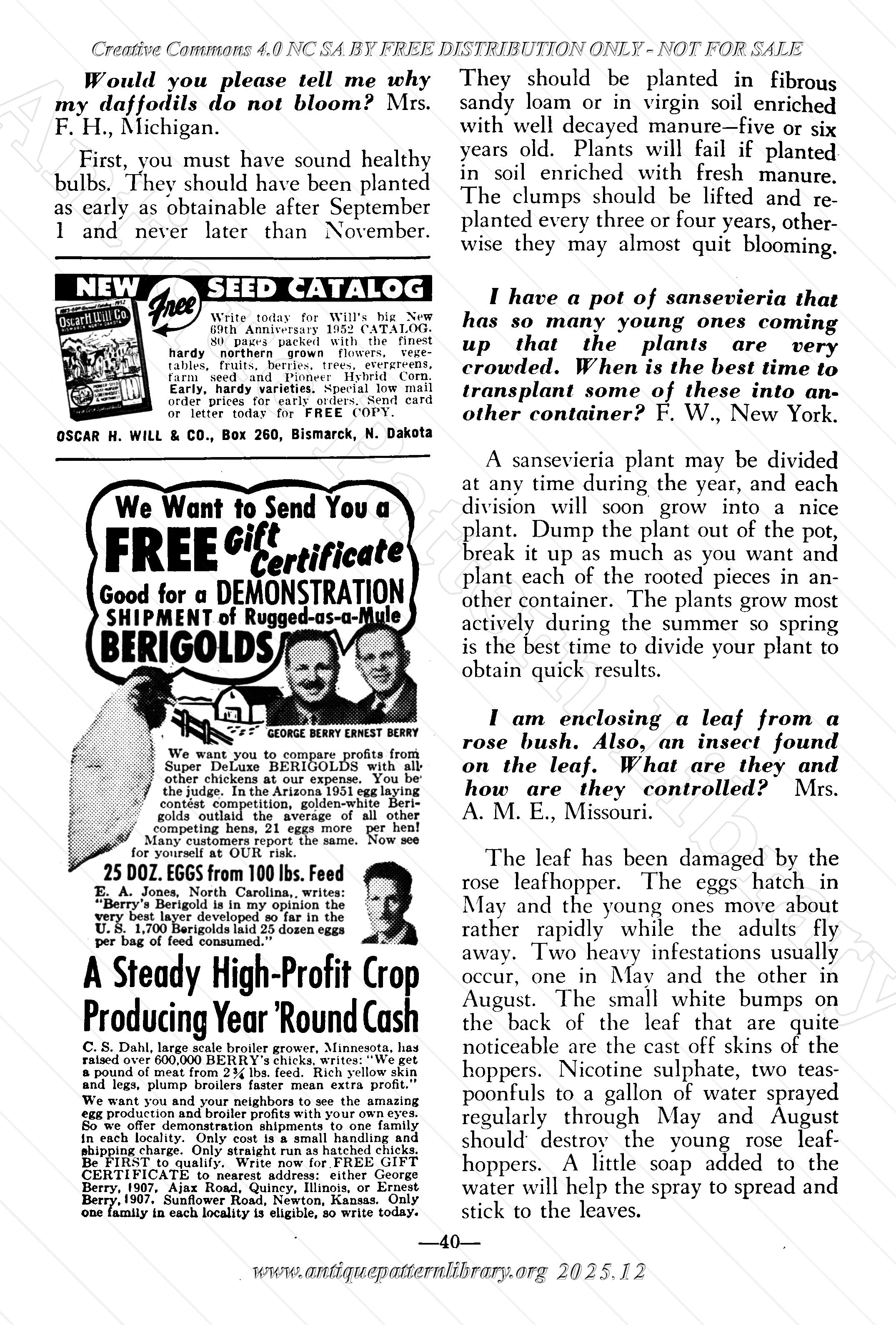How to make a crocheted place mat, attractive Pansy Pan Holder, crocheted Sandals. Also, filet crochet handkerchief trim with a tatted edge, crocheted Iris and Cross Doily, Two Color Knitted Mat, Cardigan in Crochet, Make Your (hooked) Rugs, explanation about US beef grades, recipe for Beef Stew. Aunt Ellen's Club Notes: article about the organization of Bake Sales as a way of making money. Hat making: small hats out of big ones. Tatted Doily (actually tatted edging around linen circle. Crochet: Dresser Scarf with Butterfly Trim. Some Knitting Tips, Stitching Names on Shirts, Knitting for Tots, Crocheted Insertion for Baby, another Filet Corner Handkerchief Trim. Sewing: Apron made from handkerchiefs, an article about Hemstitching by hand, and so many advertisements!