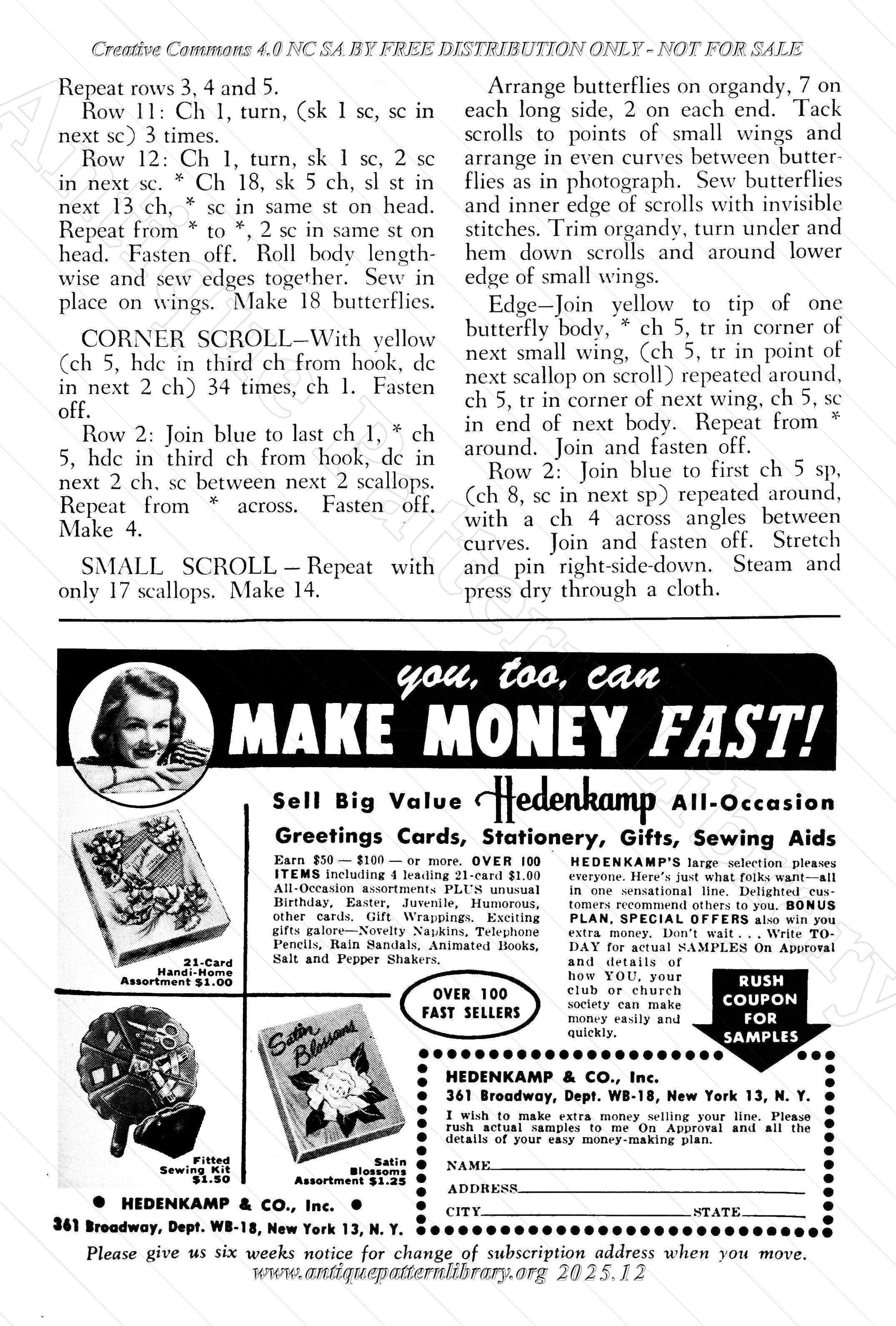 How to make a crocheted place mat, attractive Pansy Pan Holder, crocheted Sandals. Also, filet crochet handkerchief trim with a tatted edge, crocheted Iris and Cross Doily, Two Color Knitted Mat, Cardigan in Crochet, Make Your (hooked) Rugs, explanation about US beef grades, recipe for Beef Stew. Aunt Ellen's Club Notes: article about the organization of Bake Sales as a way of making money. Hat making: small hats out of big ones. Tatted Doily (actually tatted edging around linen circle. Crochet: Dresser Scarf with Butterfly Trim. Some Knitting Tips, Stitching Names on Shirts, Knitting for Tots, Crocheted Insertion for Baby, another Filet Corner Handkerchief Trim. Sewing: Apron made from handkerchiefs, an article about Hemstitching by hand, and so many advertisements!