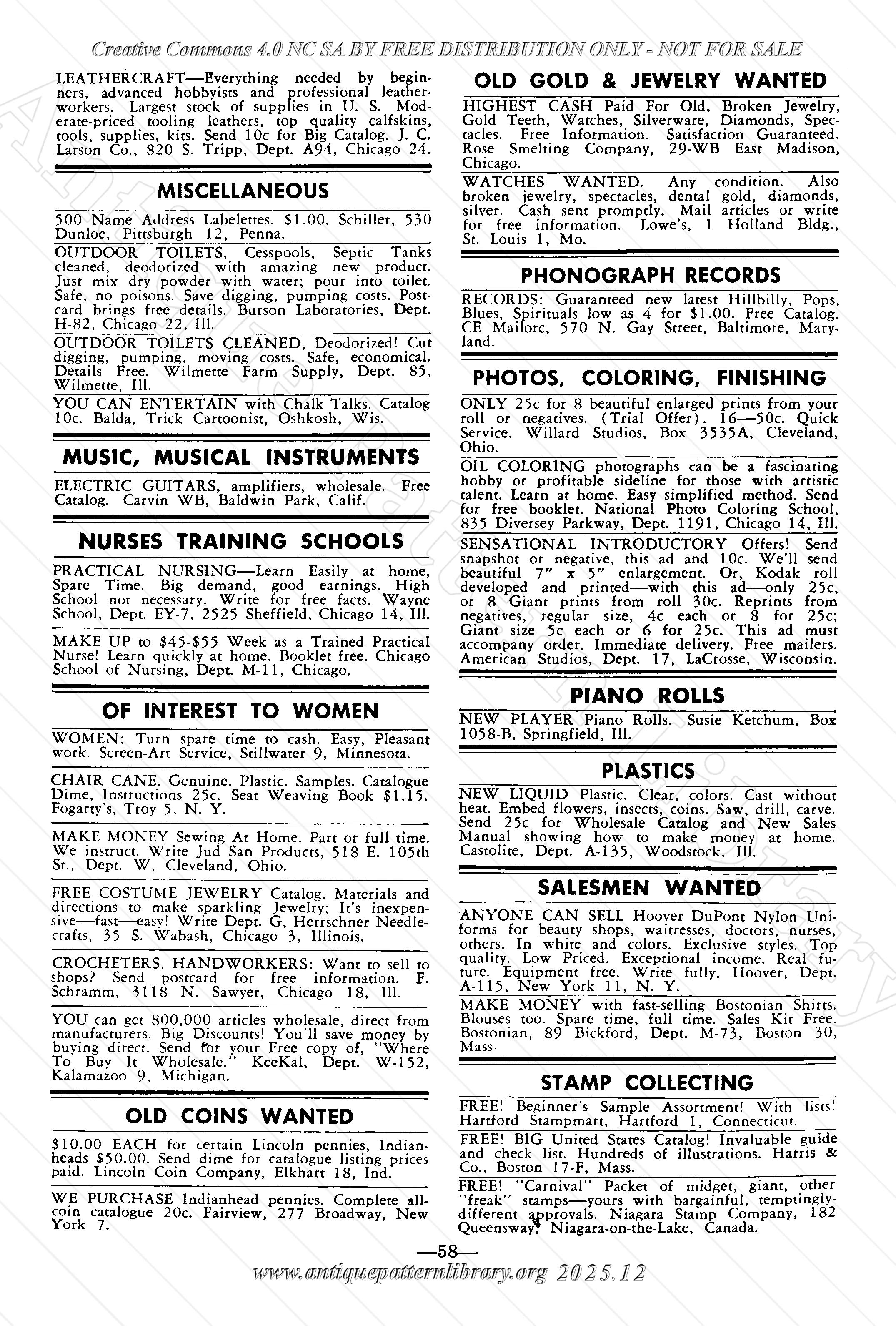 How to make a crocheted place mat, attractive Pansy Pan Holder, crocheted Sandals. Also, filet crochet handkerchief trim with a tatted edge, crocheted Iris and Cross Doily, Two Color Knitted Mat, Cardigan in Crochet, Make Your (hooked) Rugs, explanation about US beef grades, recipe for Beef Stew. Aunt Ellen's Club Notes: article about the organization of Bake Sales as a way of making money. Hat making: small hats out of big ones. Tatted Doily (actually tatted edging around linen circle. Crochet: Dresser Scarf with Butterfly Trim. Some Knitting Tips, Stitching Names on Shirts, Knitting for Tots, Crocheted Insertion for Baby, another Filet Corner Handkerchief Trim. Sewing: Apron made from handkerchiefs, an article about Hemstitching by hand, and so many advertisements!