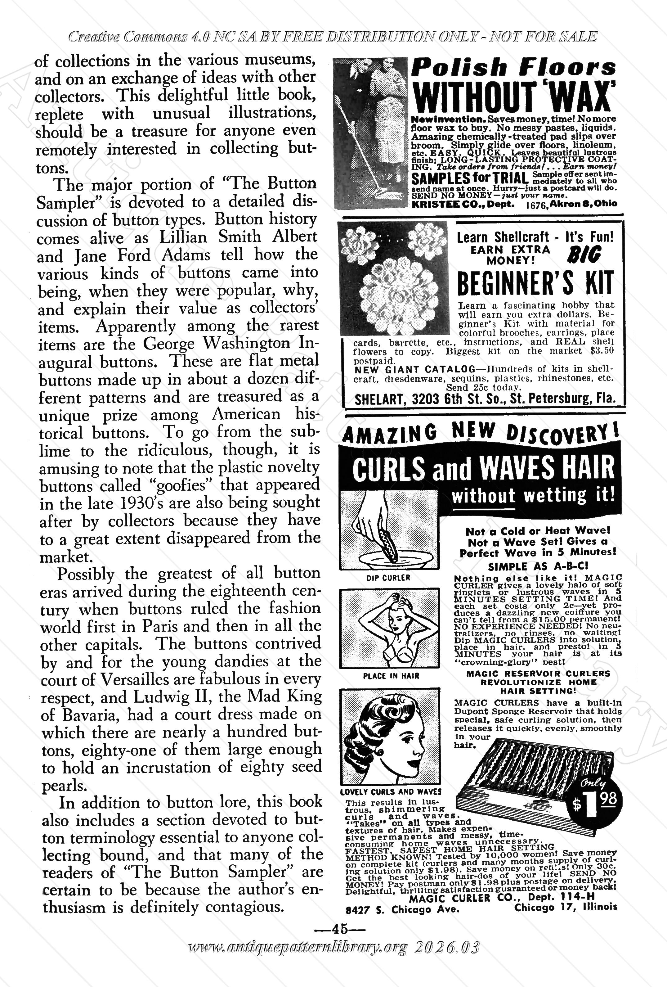 Crochet projects include a Star Flower doily. a vanity set, powder puff set, baby shoulderette and 2 motifs: a rose and a square. To tat are cluster earrings. To knit is a pillow inset where the skirt is knitted and the rest is embroidered. Have you every wanted to make a sofa pillow out of ties? Creative women make income on baking Happy Hat cakes and selling reused spice jars decorated as salt and pepper shakers. Recipes include pineapple cookies and a variety of icings. Aunt Ellen talks of studying the stars. The garden expert covers ridding worms, cyclamen mites, thrips, mildew, leafdrop, soft scale, and sowbugs. How to take care and grow your Christmas Cactus is covered. It's time to raid our button jars as Mrs. Carrie Baer shows us how to turn buttons into Earrings, cuff links, stick pins, rings, and chokers. The book reviewed this month, named "The Button Sampler", is timely with Mrs. Baer's projects, covering types, history, and terminology of buttons. Read the book to find out what Goofies are.