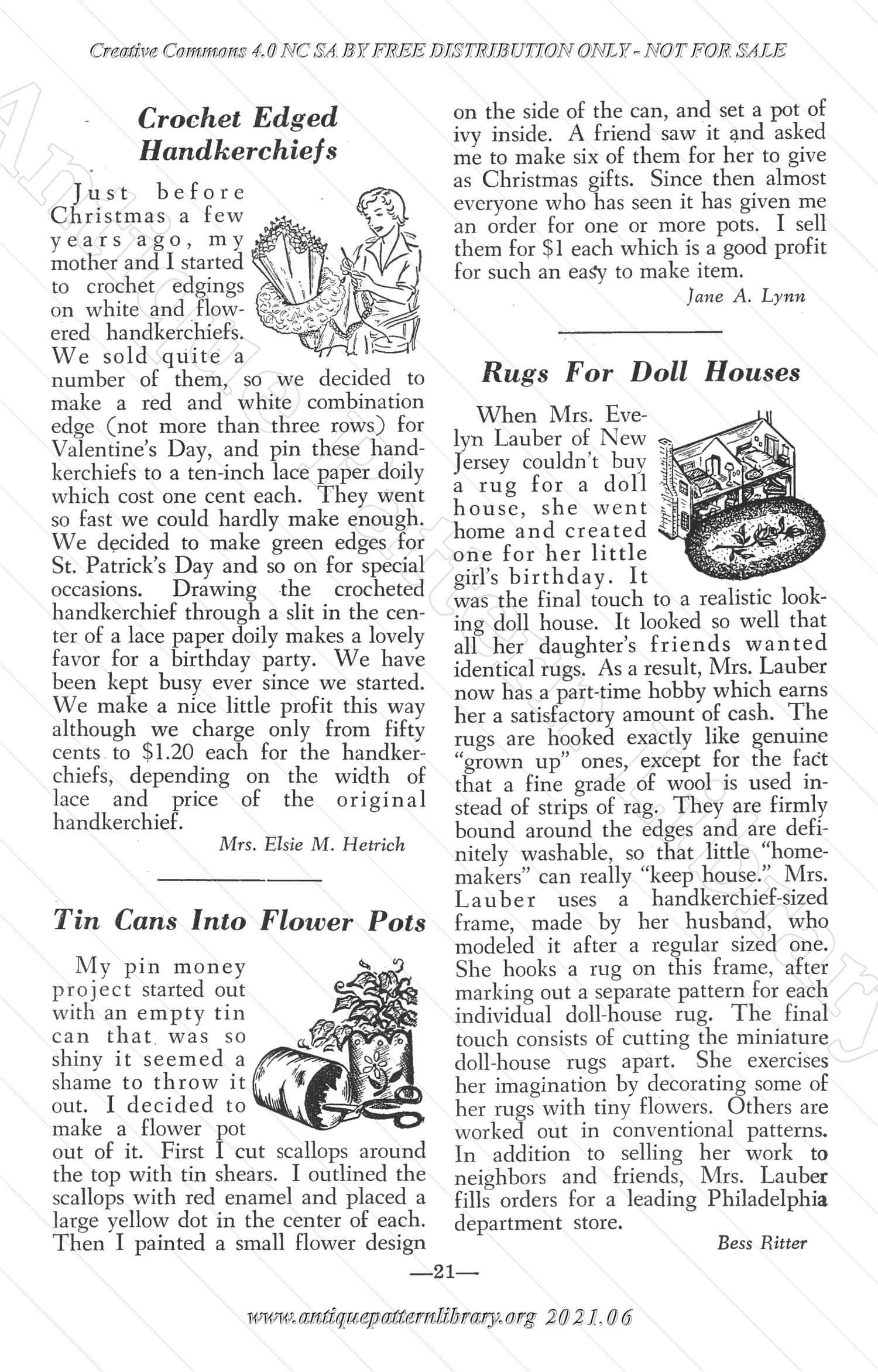 64 pages. Crochet: Vanity Set and Scarf. Winding lampshades, ceramic pins. Crocheted Baby Set. Aunt Ellen's Club Notes. Crocheted Pan Holder Set, Embroidered Christmas Cards. Quilting: Pilgrim Boy Block. Knitting: Cable Stitch Tam. Tatting: Tatted Collar. Crochet: Night Table Doily, Picot Cluster Crochet Edge. Knitting: Knitted Pinwheel Doily. Quilting: Star of Bethlehem. And many, many advertisements.