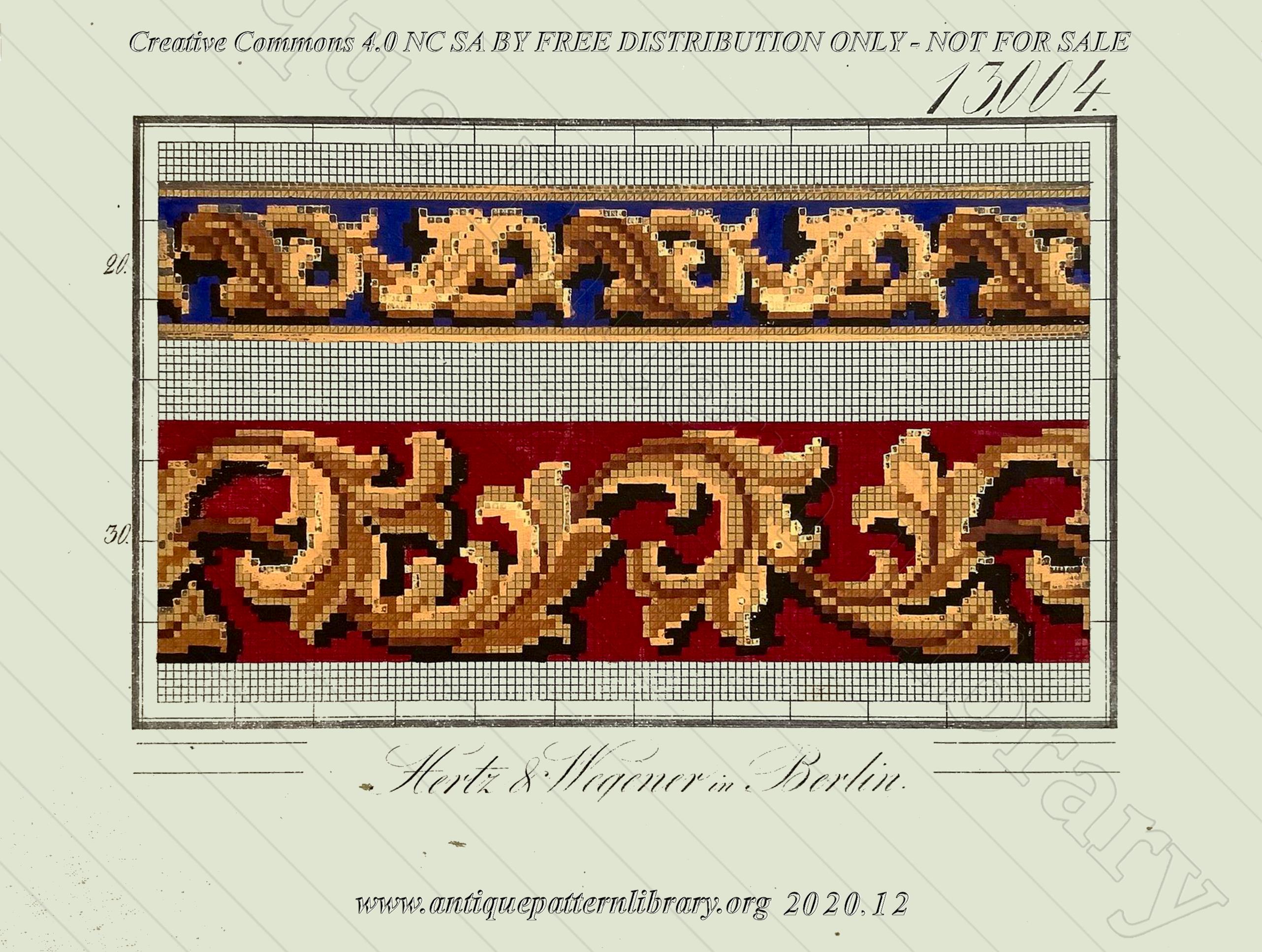 Handpainted Berlin woolwork pattern on greyish cardboard, two borders with a curly design, one with a blue background 20 stitches high, the other with a red background 30 stitches high.